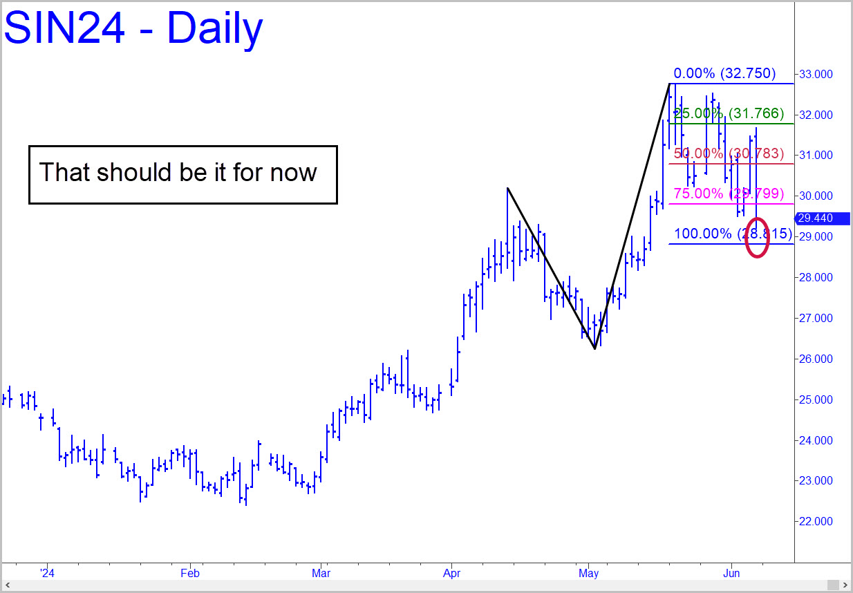 The reverse pattern shown is sufficiently authoritative to imply that July Silver is unlikely to dip significantly below the 28.815 Hidden Pivot target, at least not over the near-term. It took a brutal gang-bang by sellers to bring the futures down to the pattern’s point ‘C’ low at 28.815, but the sleazeballs who manipulate silver’s price were probably piqued by the increasingly shrill noise from bulls who felt that the metal’s handlers were losing control. Bottom-fishing will enjoy favorable odds this week, so stay tuned to the chat room and turn on your email notifications if you want to stay apprised.