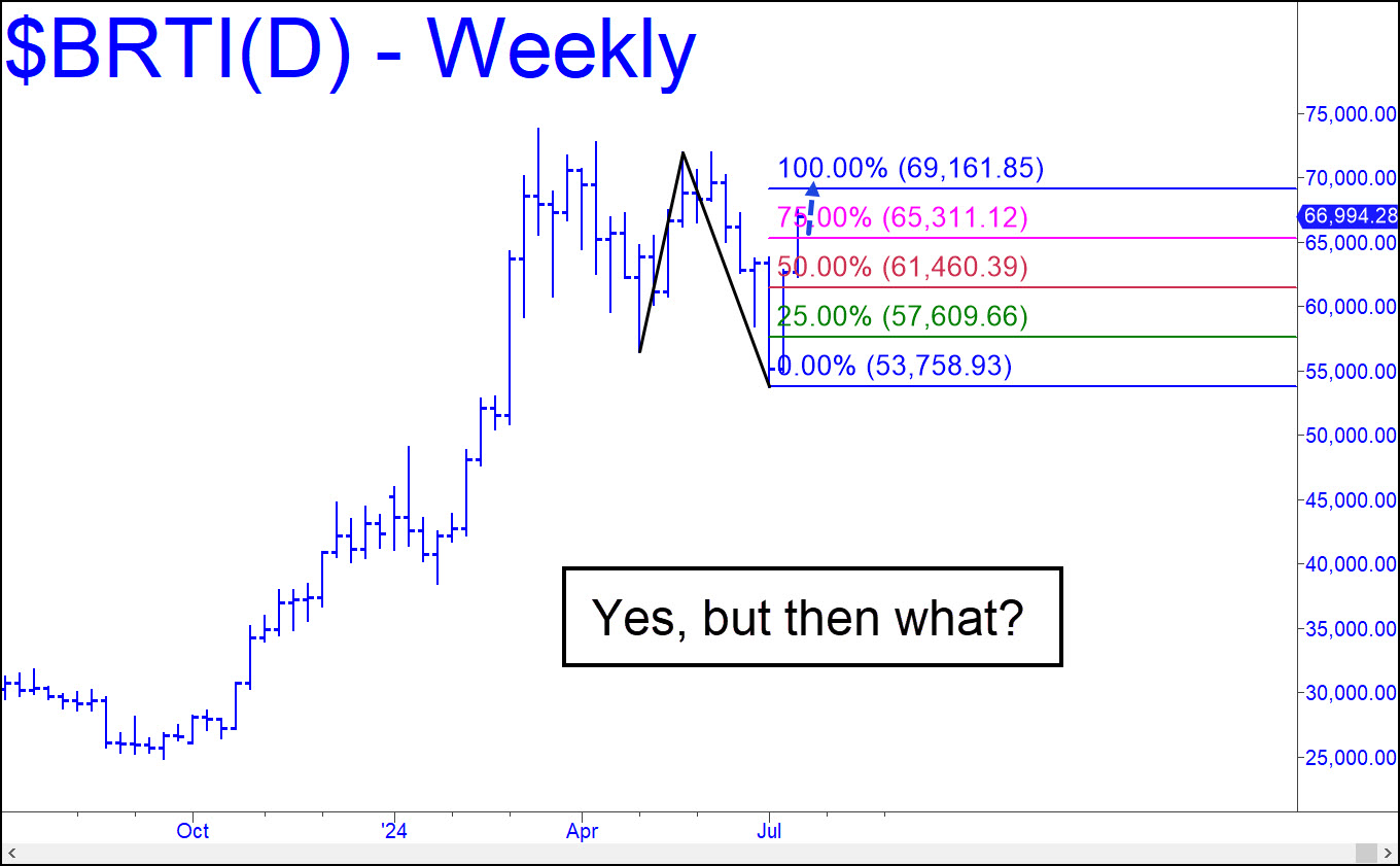 Bertie is a lock-up to reach the 69,161 target shown, but it will need to close for two consecutive weeks above 71,395 to put an 89,029 ‘D’ target in play. It goes with this pattern, and it is the highest projection I’ve identified that is tied to Hidden Pivot levels. It is curious that bitcoin rose so sharply in a week that featured heavy selling in the S&Ps and the tech stocks. I can’t imagine that the King of Cryptos would be considered a safe-haven asset, but if so, then perhaps the End of Times is nearer than we’d thought.