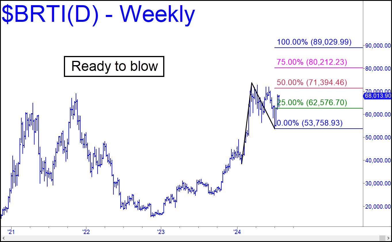 While the broad averages were getting pounded last week, bitcoin’s deft handlers were displaying the kind of brash confidence that all but guarantees significantly higher prices — and soon, especially if stocks continue to recover. Use p=71,394 as a minimum upside projection for the near term, and expect this hoax to punch through this Hidden Pivot with little difficulty. That would shorten the odds of a finishsing stroke to the 89,029 target flagged here earlier.