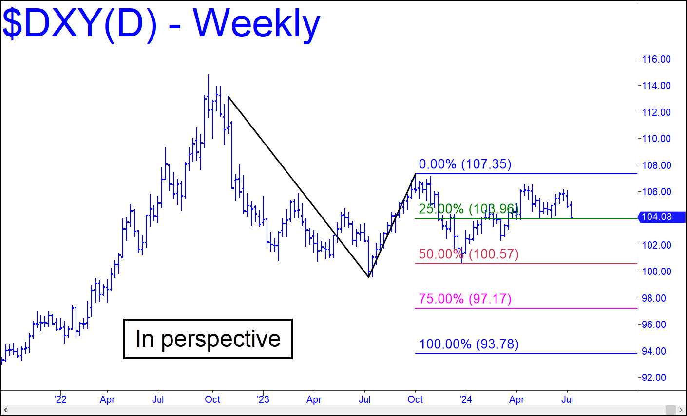 The dollar got hit hard on Thursday, but the weekly chart shown in the thumbnail inset puts it in perspective. DXY has been scuddling sideways since December, and there is scant evidence it will break out of the approximately five-point range in which it has spent most of 2024. It would pick up voodoo-number support 90 cents below, at 103.18, but sellers would have to pound it through p=100.57 to create even a hint of trouble. Regardless, D=93.78 is theoretically in play, so we should keep close track of lesser abcd patterns to determine which way the wind is blowing. _______ UPDATE (July 28): Zzzzzzzzzzzzzzzz.