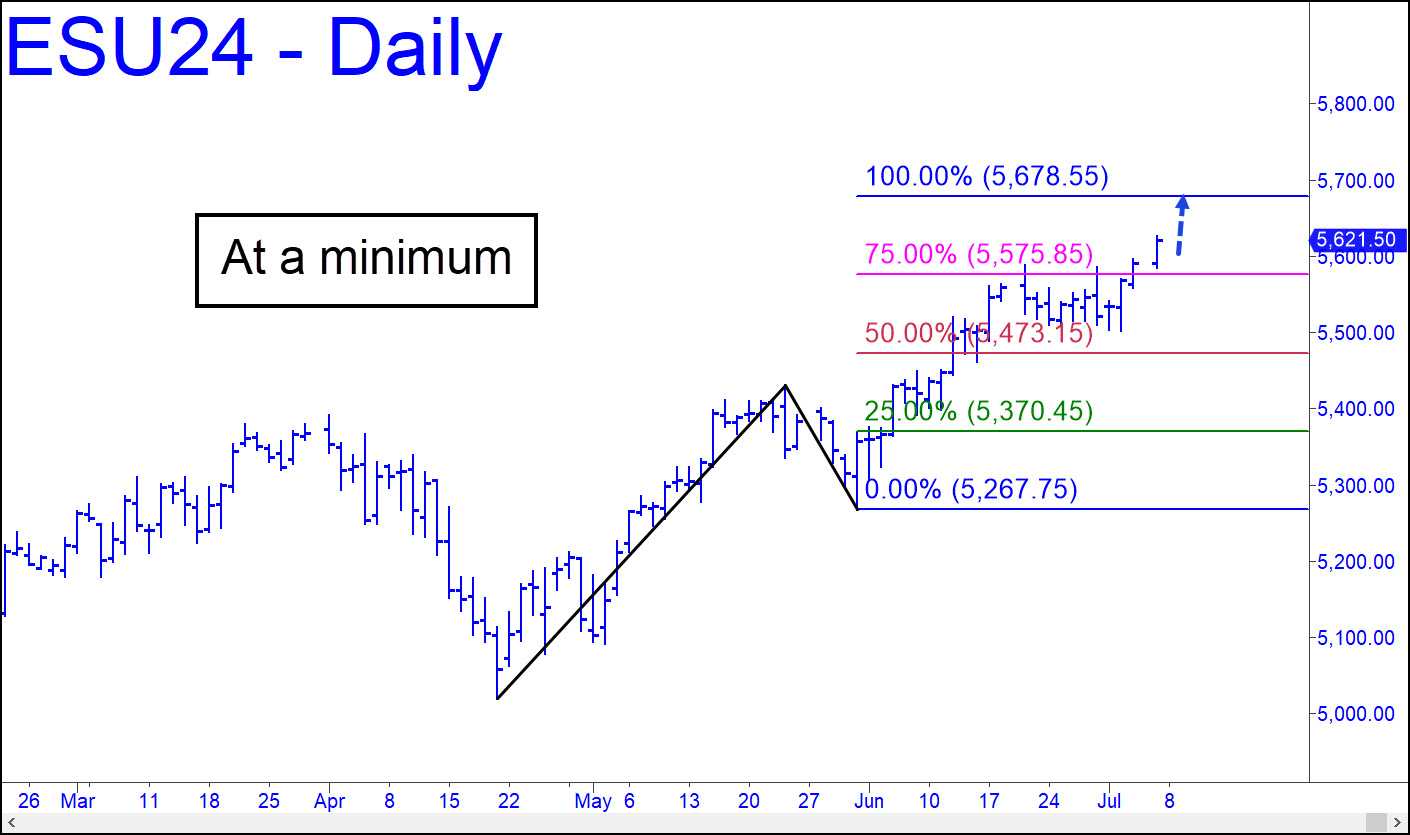 The futures closed effortlessly above a 5606 ‘hidden’ resistance that was not exactly chopped liver, so we should infer they are now bound for at least 5678.50, the Hidden Pivot target shown in the chart. It is theoretically shortable, especially if you know how to craft a risk-averse, camouflage ‘trigger,’ but your trading bias should be bullish until the target is reached. A pullback to the red line (p=5473.00) can be bought ‘mechanically’, stop 5405.50, but I don’t expect Mr Market to gift us with such a generous buying opportunity. _______ UPDATE (July 10, 5:30 p.m.): Wheeeeeeeeeeeeeeeeeee! Here’s an unconventional pattern with a 5879.50 target that will ave to be treated as viable because it’s all we’ve got at the moment. Trade with a bullish bias until it is reached, or don’t trade at all. Yes, the rally could fail at p2=5726, but I wouldn’t want to put ideas in your head.