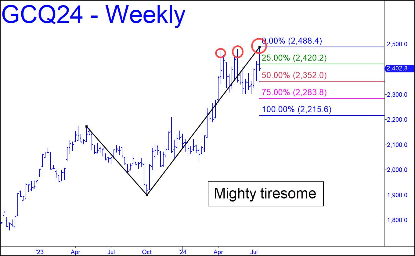 Three successive, marginally higher tops in the last three months have made this vehicle more than a little tiresome. The futures will need to come down to at least p=2352.00 of this latest, bullish pattern before we can get a confident read on how long the tedium might last before gold blasts off toward 3000. We might be able to determine trend strength accurately as early as Monday or Tuesday by looking at patterns going in either direction on the lesser charts, so stay tuned.