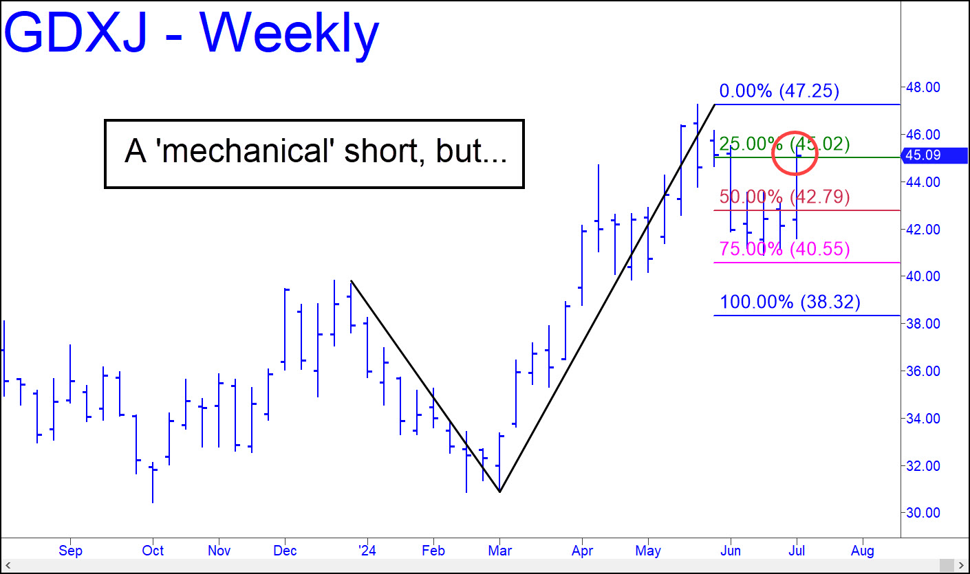 The ‘mechanical’ short GDXJ triggered last week when it popped to the green line (x=45.02) is tempting, but I’ll suggest spectating instead, since Comex Gold’s chart is less appealing as a bear play, even a short-lived one. The shorting signal means this vehicle is likely to fall back to at least p=42.79 before it can attempt a push past the pattern’s point ‘C’ high at 47.25. For now, we should pay close attention to abcd corrections on the lesser charts, since they will be warning of a relapse if their respective downside ‘d’ targets are exceeded. ______ UPDATE (Jul 12): Buyers have blown through May 20’s peak at 47.25, but price action has been less bullish in gold futures, which are still on a ‘mechanical’ sell signal. Time will resolve this odd discrepancy, probably in bulls’ favor, but I’ll wait for it to happen before hazarding a forecast you can bank on.