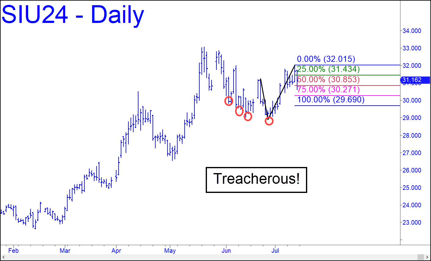 September Silver has stopped out no fewer than four previous lows on the daily chart since this consolidation began in late May, so we’ll be extra careful about where we get on and off the bullish bandwagon. We can use the reverse pattern shown to get long the next time, but because the futures breached p=30.85 and closed below it on Friday, we may have to wait until the retracement hits d=29.69 before we hop aboard. The turn could conceivably come from p2=30.27, so stay open to the possibility.