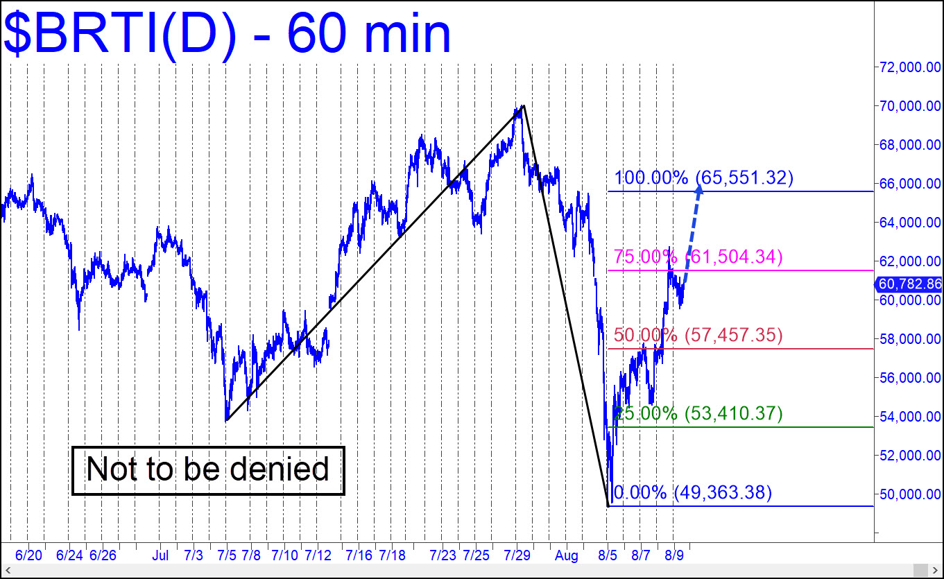 This hoax just won’t stay down, mainly because there is never much supply, and because it has such strong, shameless institutional support from players with no skin in the game. They all know better, but touting the cryptos helps perk up their humdrum lives while giving them something to talk about with kids in the neighborhood who have opted for the excitement of the Robin Hoodie life rather than mowing lawns. Look for Bertie to achieve the 65,511 target shown, then to stall there for long enough for nimble players to scalp a short. A pullback to the red line (p=57,457.35) can be bought mechanically, stop 54,759.38. _______ UPDATE (Aug 16, 3:30 a.m.): If you bought at the red line (p=57,457) as recommended, you have a $1,000 profit at the moment. Manage it as you please, using the 65,551 target flagged above as a lodestar.