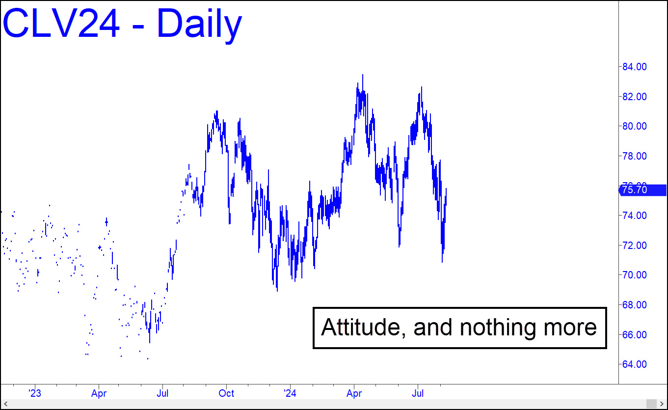 I keep crude on the front page only because it is the largest commodity market in the world. That said, the world’s largest commodity market has been doing little but jacking off for more than a year, demonstrating that the main purpose of global markets is…to jack off. What a joke! This would be an embarrassment to all humanity, but for the fact that nothing could embarrass a civilization in which a hit single with the title ‘Wet-Assed Pussy’ could briefly become the most listened-to pop ‘song’ in the world of so-called music. The woman responsible for it, Cardi B, probably regards the poobahs at Disney, the SEC and on Capitol Hill as peers — and not without good reason, since they are all American success stories of one sort or another. The foregoing aside, crude prices cannot be suppressed indefinitely in a geopolitical world that lives, from one day to the next, under a deep purple storm cloud. The traders who have been doing the jacking off in both directions must be close to spent by now, so don’t be surprised if the intrepid dirtballs who control this monster spring a nasty trap on scalpers who can’t wait to short yet another rinse-and-repeat peak in the low $80s.