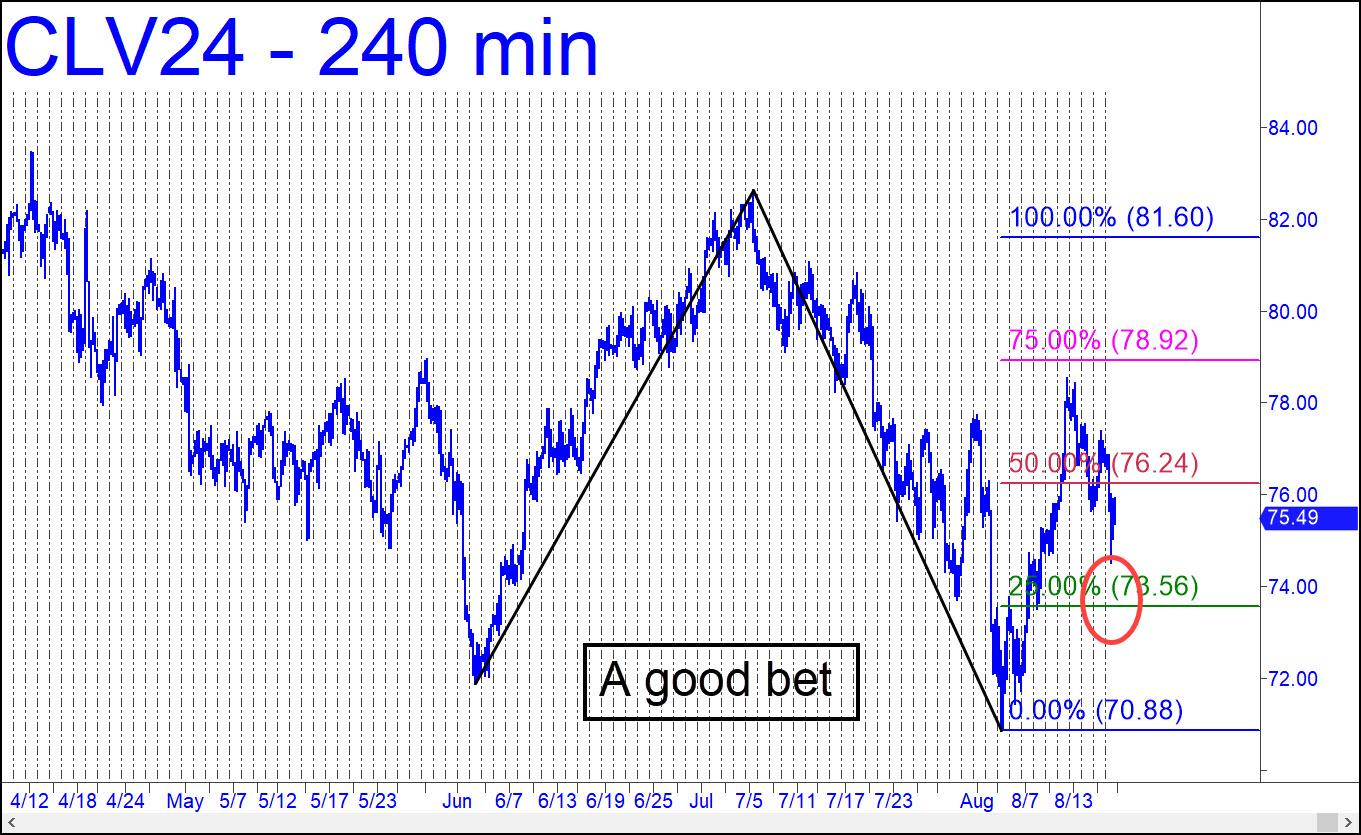 With expectations of a rally into the low 80s at least, we should be prepared to bottom-fish this correction when it comes down to the green line (x=73.56). This is a ‘mechanical’ set-up, and it comes with the caveat that x is neither target, nor support, nor Hidden Pivot, just a place on charts where we set up ‘mechanical’ trades. This one looks like a very good bet, but it will require staging on the lesser charts, since the textbook stop-loss would otherwise be at 70.87, a tick beneath C. That’s too much to risk on a conventional entry, so stay tuned to the chat room for alternatives. _______ UPDATE (Aug 19, 9:34 p.m.): The futures rallied 45 cents after bottoming at 73.48, affording us a small winner of around $920 on four contracts (see my 14:58 post in the chat room for details). They have relapsed this evening and are now rallying in their wonted, psychotic fashion after making a marginal new low. Step away as crude carves out a tortuous bottom. _______ UPDATE (Aug 23): Crude doesn’t merit an update, since it’s trading exactly where it was six months ago. This is notwithstanding the flatulent rumble emanating from the charts since then. It has been paradoxically easy to trade, but you’ll have to nudge me proactively in the chat room for timely guidance. _______ UPDATE (Aug 31): Zzzzzzzzzzzzzzzzzzzzzzzzzzz.