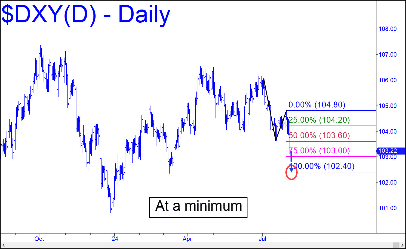Friday’s plunge through the red line (p=103.60) means the Dollar Index will fall to at least 102.40 before it can attempt to find traction. That would put it even with an important low recorded last March, but any further slippage, especially if sharp, would be signaling a plunge toward the 100.62 low notched in the final days of 2023. Here’s a longer-term chart, however, that shows a path all the way down to 93.78. That nearly unthinkable target is precisely confirmed by the bounce off p=100.57, and its attainment would become an odds-on bet if DXY closes for two consecutive weeks below p. _______ UPDATE (Aug 9, 2:02 p.m.): The dollar has bounced modestly from 102.16, just 24 cents below the minimum downside target given above. When the rally fails as I expect it to, look for more weakness into the range 99.58-100.57, between two key lows on the daily chart that occurred, respectively, on July 19 and December 28. ______ UPDATE (Aug 16): As anticipated above, the dollar has turned lower yet again, presumably bound for the 99.58-100.57 range noted. If you trade off this vehicle, please note that DXY will have a chance to bounce from exactly 101.26, a Hidden Pivot derived from the 240-minute chart, where A= 104.45 on 8/1.