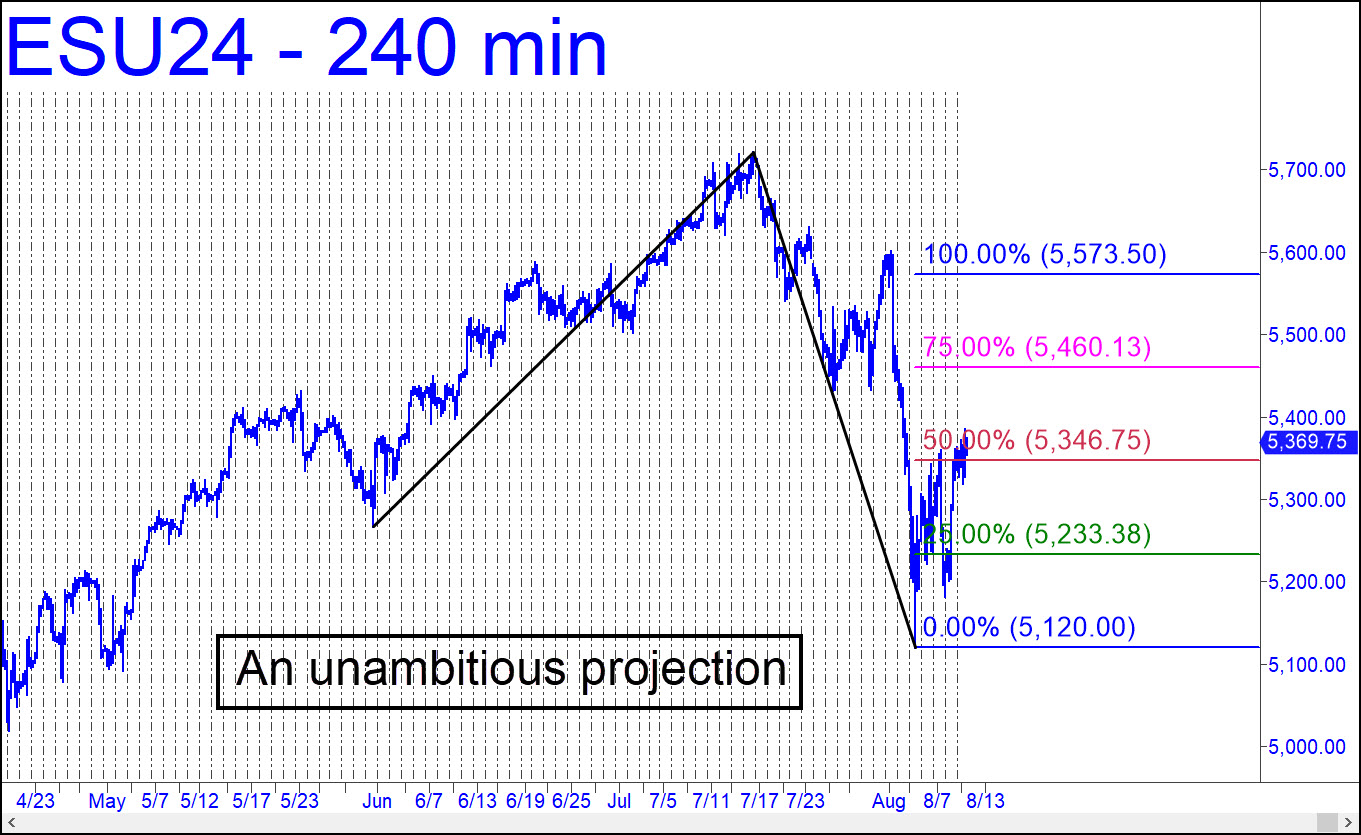 The modest pattern shown would cap this squirrelly bounce somewhat below new record highs, although I don’t mean to suggest that new highs are necessarily unlikely, let alone impossible. However, my gut feeling is that the bull market is over, and even a thrust to marginal new highs would not change my mind. The burden of proof is on bulls as far as I’m concerned, and we should guard against getting sucked in by a heavily engineered, last-gasp rally. The reverse pattern in the thumbnail chart is sufficiently gnarly to work for our purposes, whatever they be. It has already generated a profitable ‘mechanical’ buy at the red line, as well as a one-level short from it. Tightly stopped shorts at p2=5460.13 and d=5573.50 can be attempted, especially if you are familiar with the reverse-pattern ‘camo’ triggers that we use to significantly limit entry risk. ______ UPDATE (Aug 16, 2:58 a.m.): The futures pulled back a very modest 14 points from 5571.75, but that was all the opportunity we got to cover any shorts before a relentless squeeze took hold in after-hours trading. Just a little higher and the September contract should be presumed headed to the 5749.25 target, on the daily chart, of A=5092.00 on 5/2.