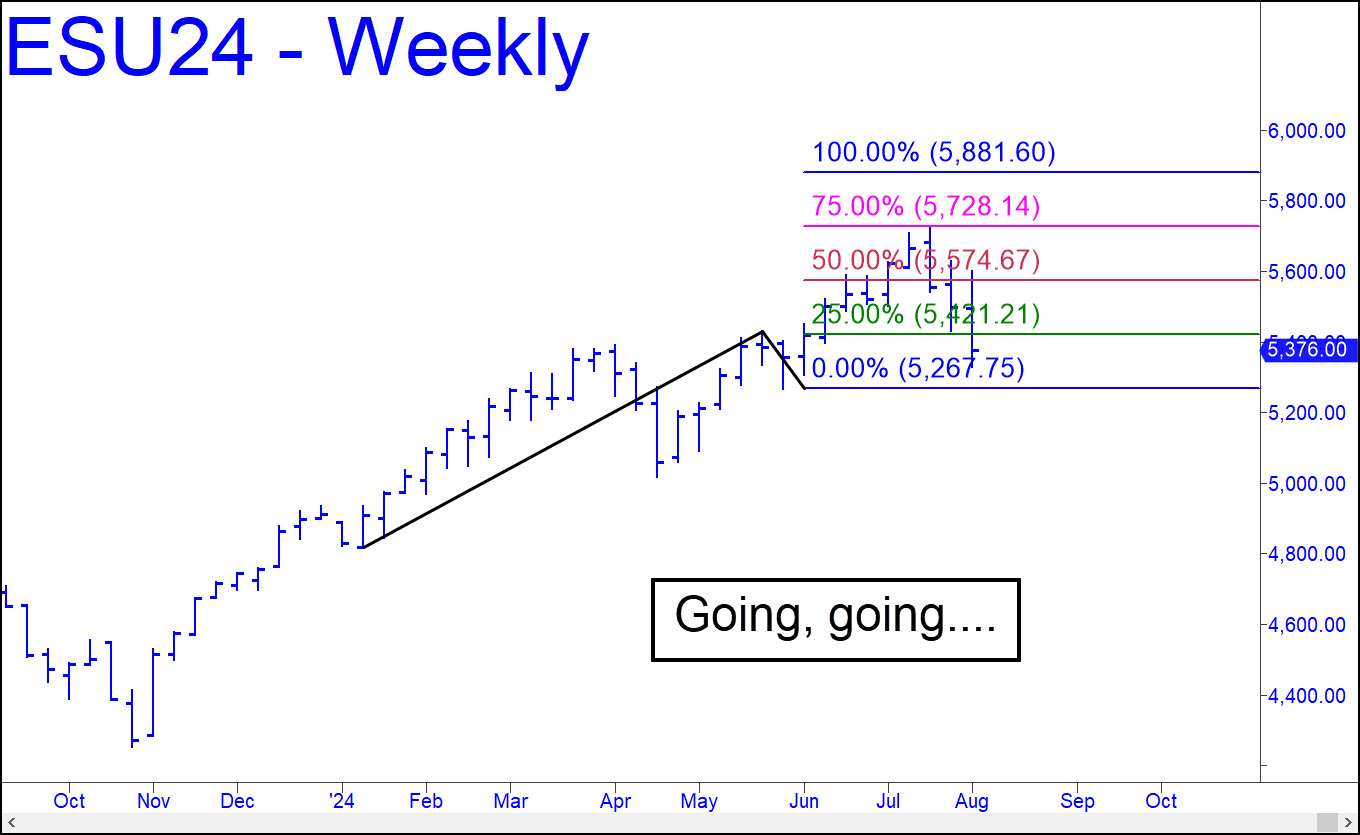 The selloff begun on July 16 tripped a second ‘mechanical’ buy signal, this time on the weekly chart. The implication is that the September contract will rally to at least p=75564.6without first dipping beneath the pattern’s ‘C’ low at 5267.75. However, there are no guarantees that any rebound will reach the D target at 5881.60, If this holds true, the bull market begun in 2009 would be over. That’s my gut feeling, but we’ll wait to see whether DaBoyz can turn things around with the benefit of a green-line (x) ‘buy’ trigger that they don’t even know exists. In the meantime, you can use a presumably gratuitous feint below ‘C’ to get long, but the theoretical trigger interval of 43-points would require risk-reduction tactics based on a ‘camouflage’ set-up. _______ UPDATE (Aug 6, 10:52 a.m. EDT): The breach of so clear and compelling a target as d=5168.75 offers persuasive evidence that the current, manic bounce is just a bear rally and a distributive fraud. Plan accordingly, and don’t get sucked by whatever Wall Street’s cud-chewing shills spew in the days and weeks ahead.