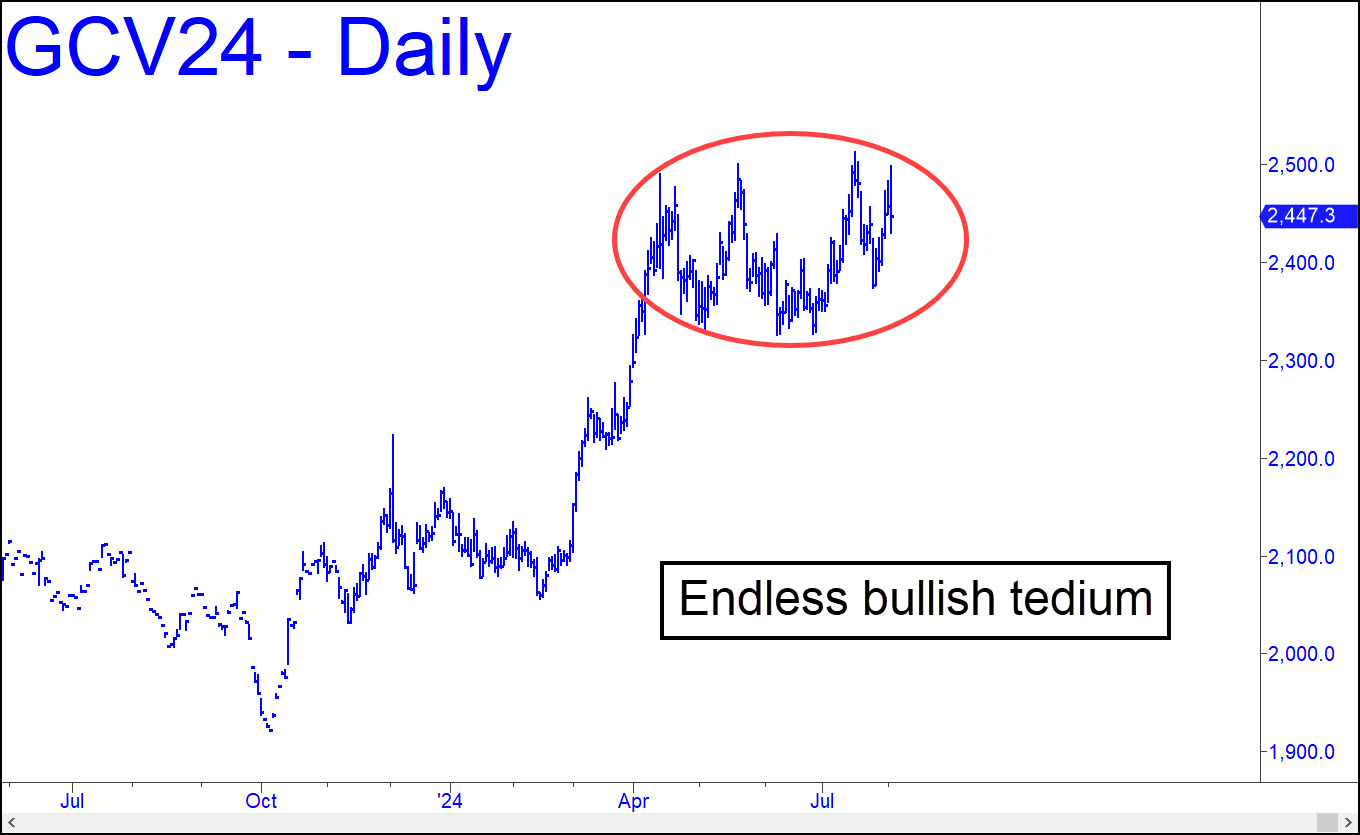Last week’s strong start laid an egg as expected, leaving yet more paint to dry on an indisputably bullish picture. The constipated price action cries out for a swoon beneath the three lows near 2330 that have occurred since April just to clear the air. We’d be ‘voodoo’ buyers down near 2351 in any case, but let’s not kid ourselves into thinking the futures would do us such a kindness. In the meantime, they remain tradable on intraday signals that have been plentiful, even in bullion’s increasingly tedious holding pattern. Stay tuned to the chat room if you care.