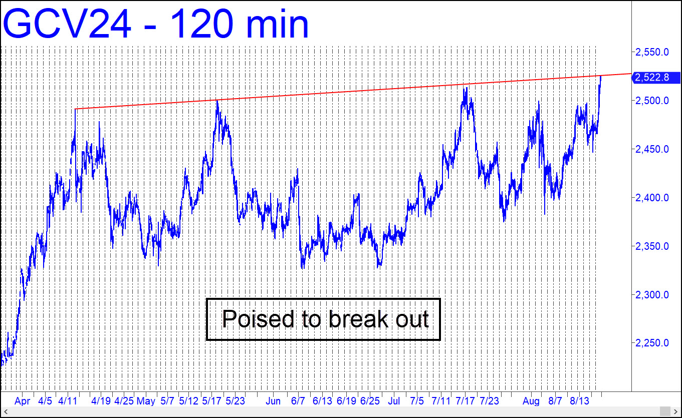 Gold took off Friday following a shallower correction than we’d become used to. It’s tempting to say that the scum balls who manipulate bullion prices for a living lost control, but more likely is that they are simply ready to let ‘er rip. In any case, the October contract finished precisely at the authoritative trendline shown, and unless DaBoyz believe they can accumulate yet more tonnage with another takedown, this week should see the breakout that will finally take gold to $3000.