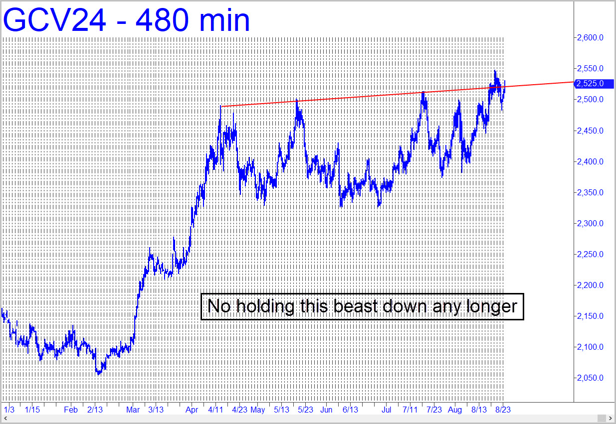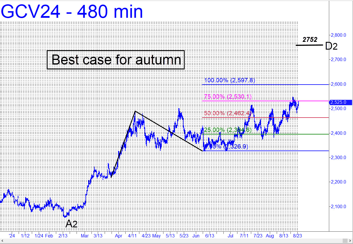 You don’t need to be a chartist to see how bulls masticated major trendline resistance last week, setting up October Gold for a push to at least 2589.60 over the near term. If that Hidden Pivot doesn’t stop the rally, 2597.80 will be the next stop, and thence 2752.20. The provenance of those last two numbers can be seen in this chart. In the meantime, any one-level pullback on the second chart would signal a ‘mechanical’ buy for a presumptive ride to D=2597.80. Intraday buying opportunities abound on the lesser charts.