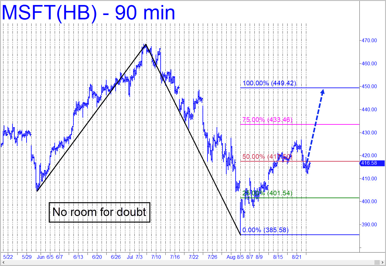 MSFT is taking its sweet old time getting to D=449.42, but it will get there. That’s very significant, because as long as there’s an outstanding rally target in this bellwether, the broad averages will continue to waft higher. A pullback to the green line (x=401.54) would offer an excellent opportunity for bottom-fishing or augmenting a long position. However, I doubt we’ll see such weakness before the stock takes another leap skyward. I will signal any impending swings if they have tradable consequences, but there is little in prospect at the moment.