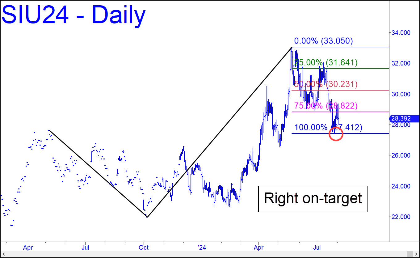 Subscribers evidently made hay with a 27.41 correction target I’d flagged here that caught the low of a nearly $2 bounce within four cents. So now what? The bounce wasn’t quite sufficient to generate an impulse leg on the daily chart, so any trading opportunities in either direction will necessarily come from the intraday charts. My hunch is that a next buy signal will materialize with a dip into the ‘discomfort’ zone bounded by prior lows at, respectively, 27.45 (7/29) and 26.55 (5/2). ______ UPDATE (Aug 9, 1:50 p.m.): Another bullseye: Last week’s low at 26.505 occurred in the exact middle of the range I’d flagged above. Spartacus was the only subscriber to mention this, but please let me know in the chat room if you used the forecast (as he evidently did) to get long near the bottom. If I hear from enough of you, I will establish a tracking position. ______ UPDATE (Aug 11, 2:25 a.m.): Assuming you are long four contracts from around 26.51, take profits on half at 27.80, then deploy an ‘impulsive’ stop-loss on the 30-minute chart. This implies stopping yourself out of the remainder of the position if a plunge exceeds two prior lows without an upward correction. At the moment, this would locate the stop-loss at 26.970, just beneath the ‘external’ low recorded on August 8 at 9:30 a.m. EDT. Make this order o-c-o with a single-contract offered to close at 28.610. _______ UPDATE (Aug 12, 1:59 p.m. EDT): Profit-taking has lowered our cost basis to 25.22 for the two contracts that remain. Continue to offer one of them to close at 28.61, tying both to an o-c-o stop-loss at 27.280. ______ UPDATE (Aug 14, 2:33 a.m. EDT): Raise the stop-loss to 27.50. _______ UPDATE (Aug 15, 3:24 a.m.): Subscribers who exited on the stop suggested above could have come away with a profit of as much as $22,800. Since a few of you reported getting long again using a reverse-pattern trigger I posted in the chat room, I have resumed tracking the October contract. Check out my posts from early Thursday morning for precise details. _____ UPDATE (Aug 16, 3:20 a.m.): The futures spent the whole day screwing the pooch at 28.045, the p2 Hidden Pivot shown in the chart I posted in the trading room almost exactly 24 hours ago. Next stop: D=28.86. A pullback to either p=28.045 or x=27.64 would trip a ‘mechanical’ buy, but the trade is only suggested for those who are familiar with this entry tactic and the stops used to manage entry risk. ______ UPDATE (Aug 16, 1:37 p.m. EDT): Although the little sumbitch did not quite pull back to 28.045 (28.085 was the low), thereby denying us a ‘mechanical’ boarding opportunity near the bottom, the ensuing rally this morning has in fact hit 28.86, overshooting the target by three cents. This is bullish.