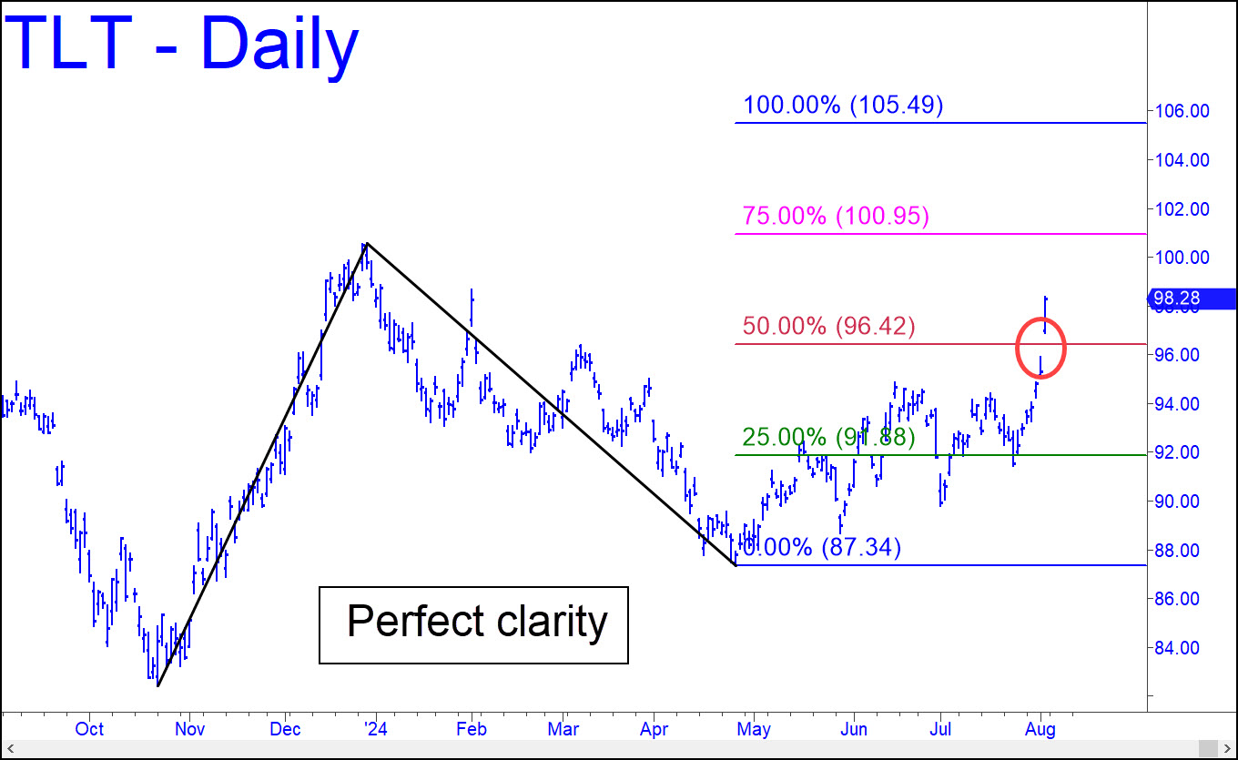 Buyers ripped through the midpoint Hidden Pivot (p=96.42) of the pattern shown with such force on Friday that there can be zero doubt where they are taking this vehicle, an ETF proxy for the long bond. The 105.49 target looks all but certain to be achieved, presumably within the next 5-7 weeks. A move of such magnitude would equate to a fall in long-term rates to 3.64% [restated from 3.67% to correct Tradestation glitch) from a current 4.11%. This will not be caused by anything the Fed does, but by the recession the banksters have kept at bay with massive quantities of funny money even when they supposedly were tightening. Another potential source of lift could come from a stampede into safety precipitated by the sight of a mushroom cloud billowing over some G-d-forsaken city or nation. _______ UPDATE (Aug 31): The spearing of ‘p’ earlier this month still makes TLT a good bet to reach the 105.49 rally target — eventually. For now, though, buyers will need to screw up their courage as T-bonds weather gale-force headwinds caused by the prodigious borrowing needs of the U.S. Treasury. A nearly 5% drop to the green line (x=87.34) looks increasingly likely before deep recession intercedes with what no one will call ‘relief’. Here’s the chart.