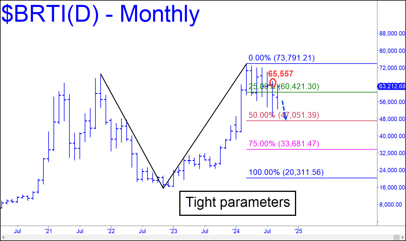 Ordinarily, I’d suggest buying bitcoin aggressively if it were to fall to 47,051, the midpoint Hidden Pivot support in the chart shown, and also to use the red line as a minimum downside target. However, the uptrend looked pretty feisty as last week ended, and so we shouldn’t rely on weakness to bring us bargain prices. If the opportunity should arise, though, a bid at 47,051 should be tied to a stop-loss at 41,954. If the order fills, I will provide updates to help you manage the risk. There are simple ways to cut initial risk by using lesser charts to fashion an entry trigger, so I’d suggest visiting the chat room for more-detailed guidance when appropriate. Meanwhile, a move above the 65,577 top of the bar I’ve circled would hint of a breakout and renewed upsurge. Upside potential over the next 4-6 months is 80,546. However, there will be risk down to 44,681, or even to 20,311, if sellers should decisively crack 47,051.