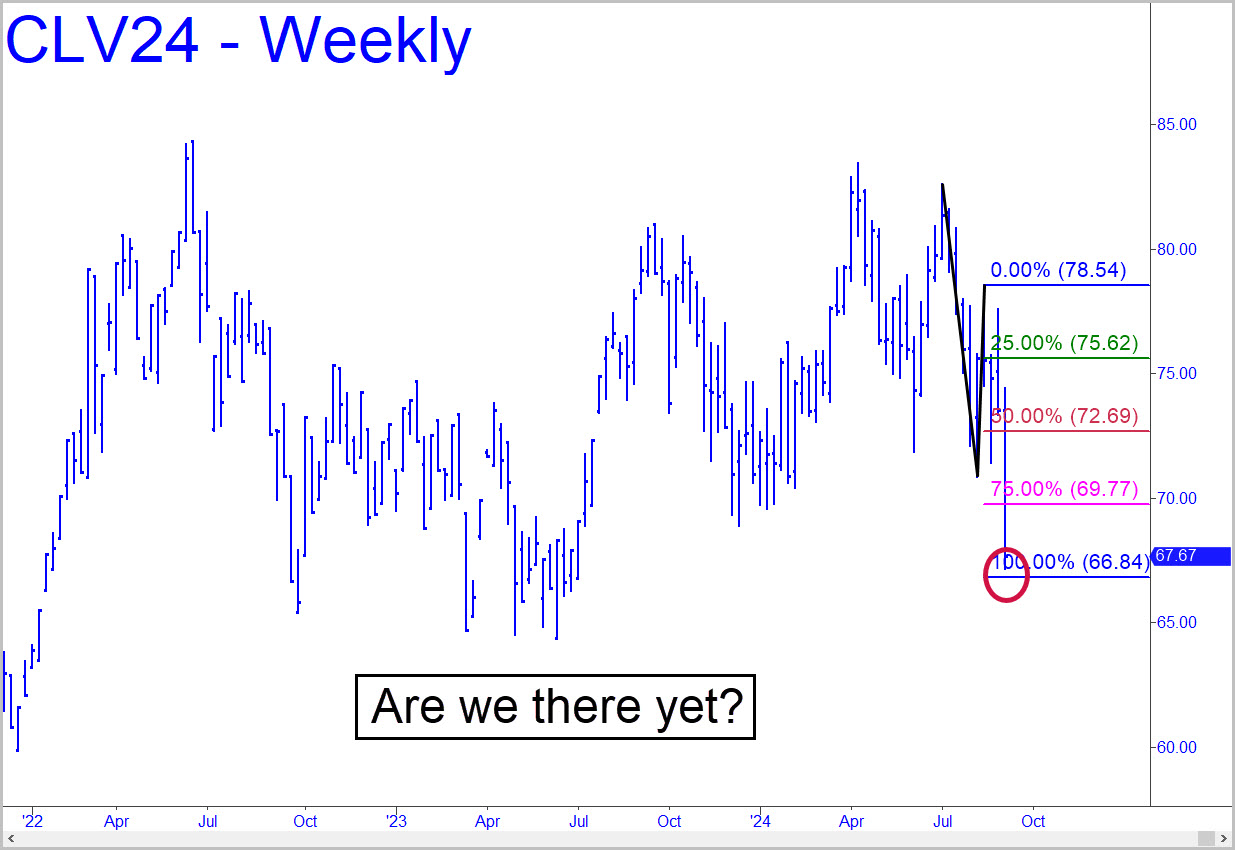 Finally, a move that warrants changing the marquee! It was steeply downward, almost touching the 66.84 ‘D’ target of the conventional pattern shown. There are two reasons to think crude’s 20% plunge since July from the low 80s will reverse here. For one, the pattern associated with the 66.84 Hidden Pivot began with an impulse leg that surpassed an ‘external’ low. This means that it is not what I call ‘sausage’, and that the resulting ABCD therefore has a greater chance of producing useful Hidden Pivot levels. Another reason a bottom is likely here is that the D target is located very close to a voodoo number, a proprietary output about which I will say no more.