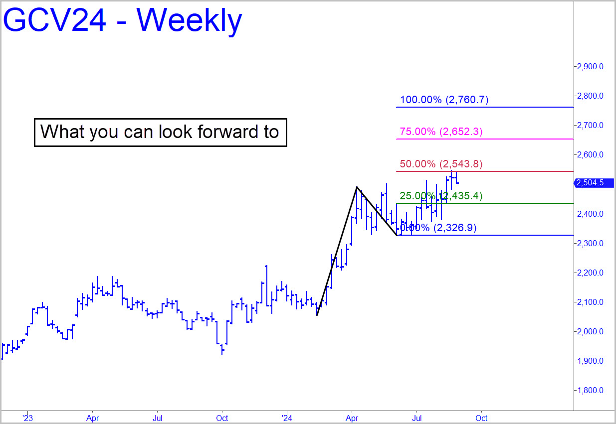 Gold’s ascent toward the 2760.70 target shown has paused in a logical place, at the p=2543.90 Hidden Pivot midpoint of the pattern. Although the strong push the futures got last February when they left the launching pad is reason to expect the target to be reached, we’ll be better able to assess the odds once we’ve seen how buyers handle resistance at p. A stab through it would all but guarantee more upside to at least p2=2652.3, the secondary pivot. In the meantime, we should alert to the possibility of a correction to the green line, x=2435.40, since that would create an excellent ‘mechanical’ buying opportunity.