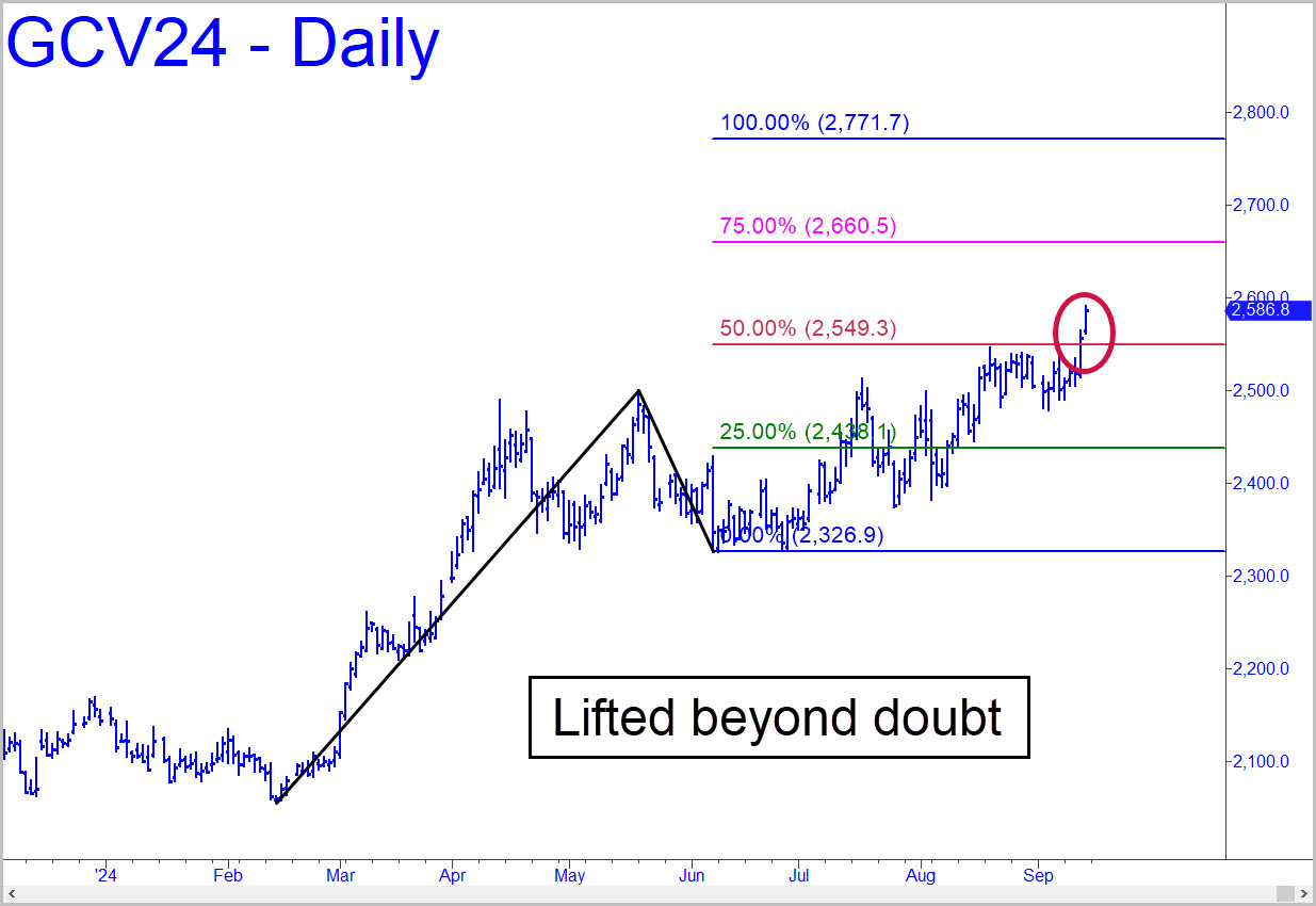 If anyone doubted gold is headed to the 2771.00 target touted here earlier, their skepticism should have been dispelled by Friday’s close at the intraday high, well above the midpoint Hidden Pivot resistance at 2549.30. The previous day’s close was above it as well, further shortening the odds that the target will be achieved, and possibly exceeded. Price action has been squirrelly enough with so many skeptics sitting on the sidelines, but we might expect the trend to turn even more evasive now that ‘everyone’ wants to be on the same side of the trade. Trends that are easy to exploit don’t exist, so don’t be surprised at whatever gold does to fool the majority. If I were Mr. Market, I would screw laggards and doubters by accelerating the upthrust, giving them yet another reason to remain on the sidelines as they wait for better prices. Bargains have come all too frequently since April, often in our faces, but you can bet that has changed.