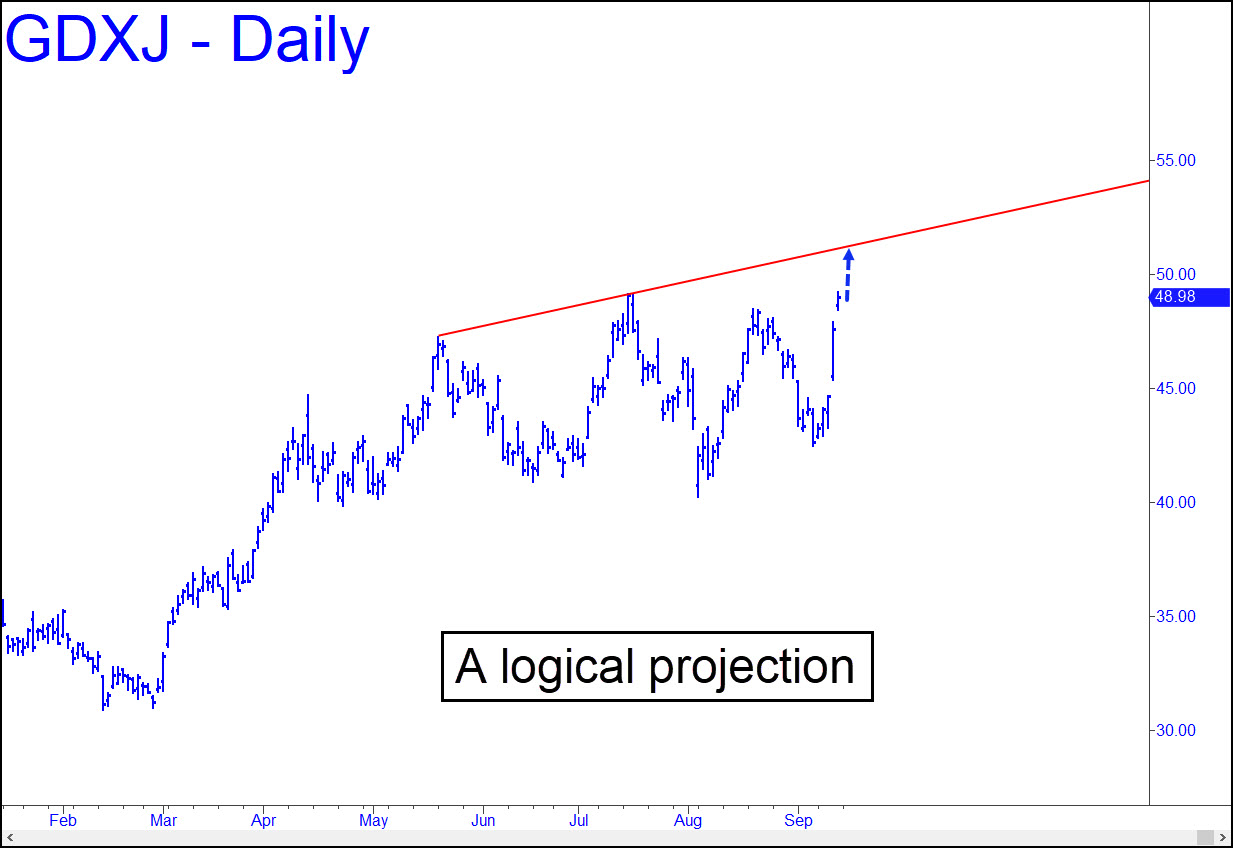 I’ve put aside Hidden Pivots to consider the simple picture afforded by connecting up the last two important highs on GDXJ’s daily chart. They yield a rally projection to 51.19 as the week begins, but you should factor an additional 0.05 per day (or 0.25 per week) to account for the trendline’s rising slope. That would imply resistance at around 51.44 come Friday. Achieving this height should pose no problem, since gold itself is in a strong uptrend with a target about 7% above current levels. If a commensurate rally were to occur in this vehicle, it would imply upside to 52.40. Can GDXJ catch up with physical? It is bound to happen eventually, presumably when speculative juices are flowing more copiously.