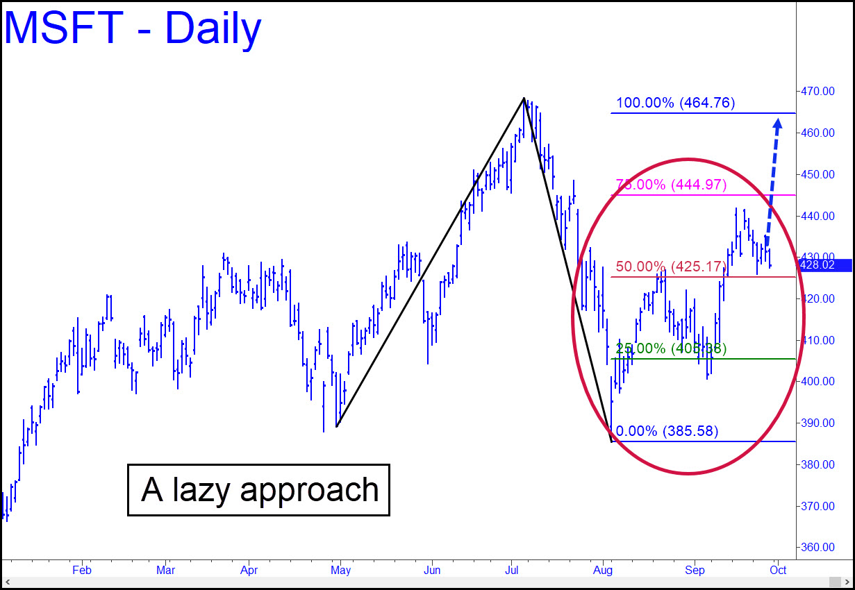 MSFT has gone flaccid — deservedly so, given September’s steep run-up. I haven’t given up on the 449.52 bull market target featured here for the last six weeks, but I am currently favoring a more ambitious one at 464.76 that provides extra room for a bull that has seemed all but unstoppable since 2009. Both are derived from the reverse pattern shown, and each should evince sufficient stopping power to be shortable. We are unlikely to be gifted with a pullback to the green line for a ‘mechanical’ entry. However, a somewhat less appealing opportunity would materialize on a correction down to p=425.17. A bid there would require a stop-loss at 411.97.