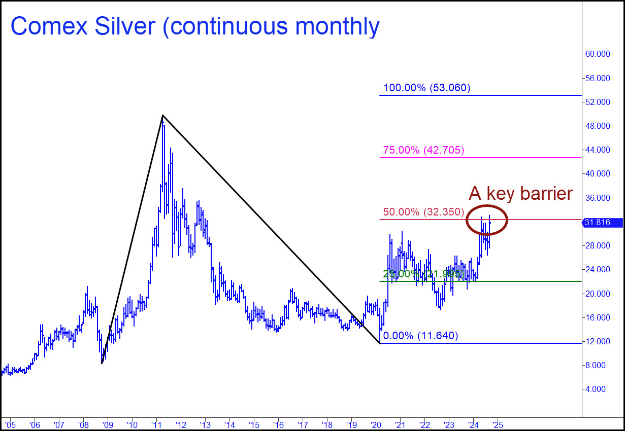 This week’s charts take a step back to show a big picture, and an even bigger one. There is most immediately a 37.249 target that traces back to the bull cycle begun in March 2020. That’s when covid madness struck and mutated unexpectedly into bullish hysteria on Wall Street. The provenance of that target is shown in the thumbnail inset. An even bigger picture that began with 8.40 silver in 2008 suggests that the bull market will top out at 53.060. Here’s a chart that shows this. You can see that bulls are stalled at the 32.35 midpoint Hidden Pivot resistance. Conquering this barrier will require two consecutive monthly closes above it or a decisive thrust to at least 35. A surge of mania could accomplish this within the next couple of months, but my gut feeling is that it will take significantly longer than that to consolidate silver for a push above 50. There can be no guarantees, however, since all price action since May has occurred off a top that failed to exceed any prior peaks. That means the larger bull phase that tacked on $2.82 since September 2022 is not impulsive. Even so, the power of the A-B leg, which took silver from 8.40 to 49.82 in three-and-a-half years, should suffice to overcome the relative timidity of the C-D leg. We should continue to trade this vehicle with an aggressively bullish bias while remaining alert to the possibility of nasty swoons of as much as $7 that institutional carry traders use to keep their short positions from blowing up and forcing delivery.