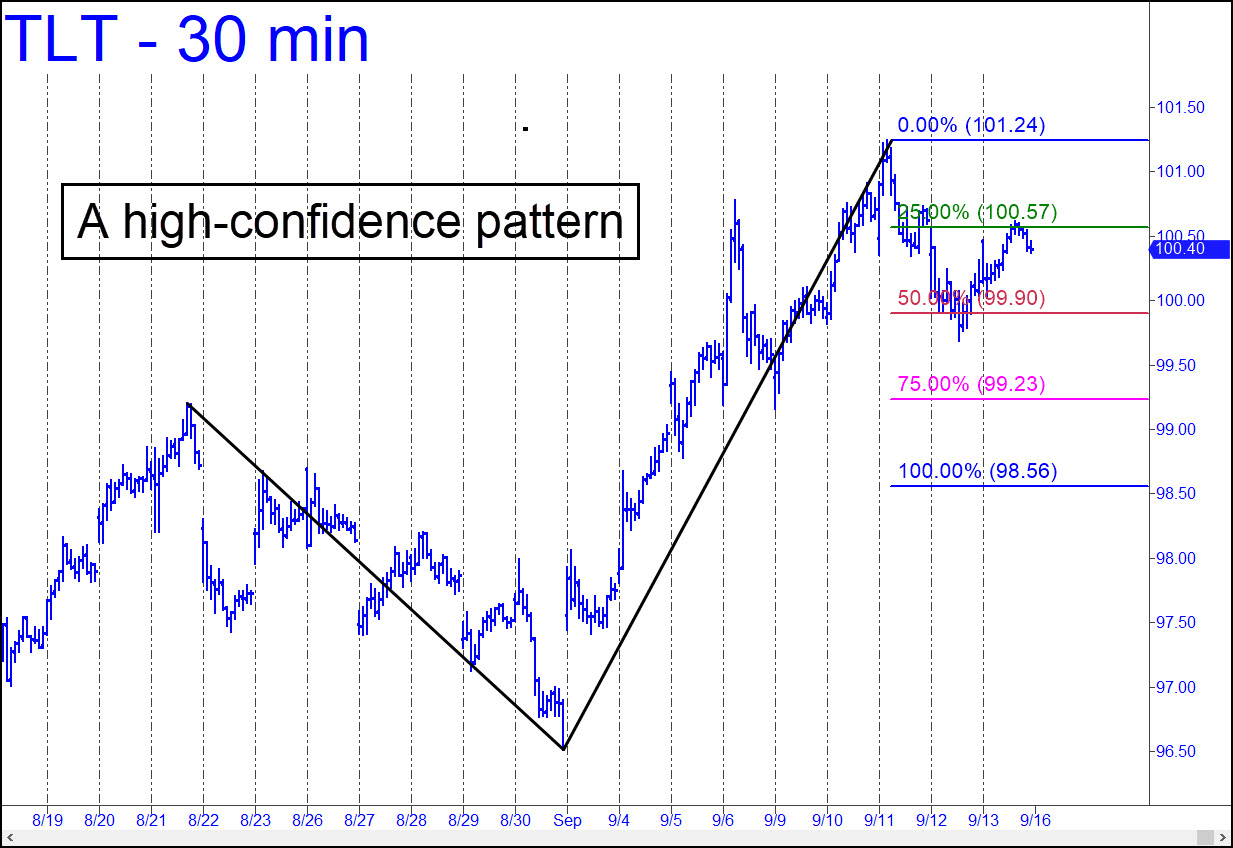 My confidence in the pattern shown is high. It is that pretty, and the ‘mechanical’ short triggered on Friday when a two-day bounce touched the green line is therefore likely to fall to at least 99.90 before TLT could find traction. However, a decisive breach of the red line would imply more slippage over the near term to as low as 98.56. The bigger picture remains bullish and points to 105.49 over the near-to-intermediate term, with long-term potential to as high as 150.12 (!). The much lower interest rates this implies should not be regarded as good news, since yields could fall to those levels only in the throes of a very deep recession or a depression.