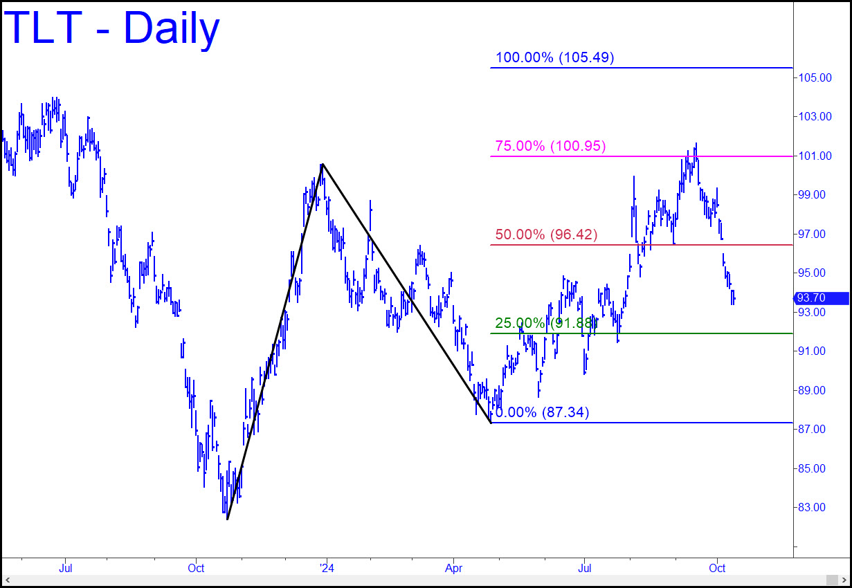 The daily chart (see inset) lacks sufficient power to push TLT significantly above the 105.49 target over the next 2–3 years. However, the tailspin that has followed mid-September’s 101.64 top is likely to end on or around the green line (x=91.88), where a ‘mechanical’ buy would be in effect. I’ll guarantee at least a one-level profit thence, although there can be no guarantees the decline will even reach the green line to fill your bid. The bigger picture is iffy but allows for a move to 116.43, the midpoint Hidden Pivot resistance of the long-term reverse pattern shown here. The rally to the green line has twice signed such a move, but the signal is weak, and a relapse to new depths is possible even if TLT reaches 105.49. Don’t cheer too loud for this, since it could only happen via a debt deflation that would turn real rates as low as 1%-2% into a crushing burden, as occurred during the Crash of 2007-08.