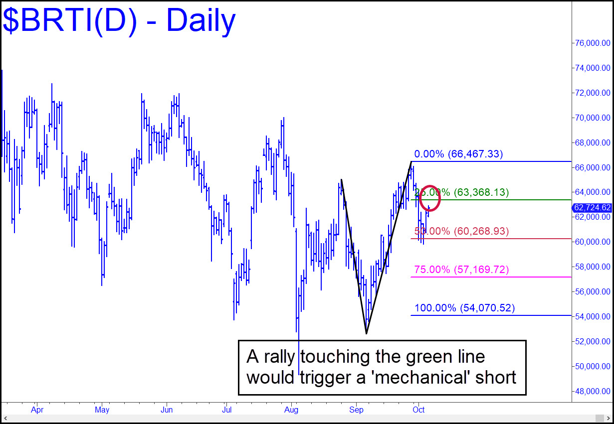 Last week’s moderate rally brought this real-time bitcoin proxy close to triggering a ‘mechanical’ short at the green line, 63,368. Downside potential thereafter would be to 54,070 or even to 47,051 before bulls could get traction for a sustained move to new record highs. The textbook stop-loss would be at 66,467, implying $3,100 of entry risk, but you should visit the Rick’s Picks trading room for guidance if you want to learn how to cut that by as much as 95% with a ‘camouflage’ trigger. The correction from the record 73,791 peak recorded in March has been insufferably tedious, but bitcoin’s deep-pocket handlers are in no hurry to make their move, since they face very little selling pressure. Who’d want to short the stuff when there is always a threat that cryptos will become impossible to borrow?