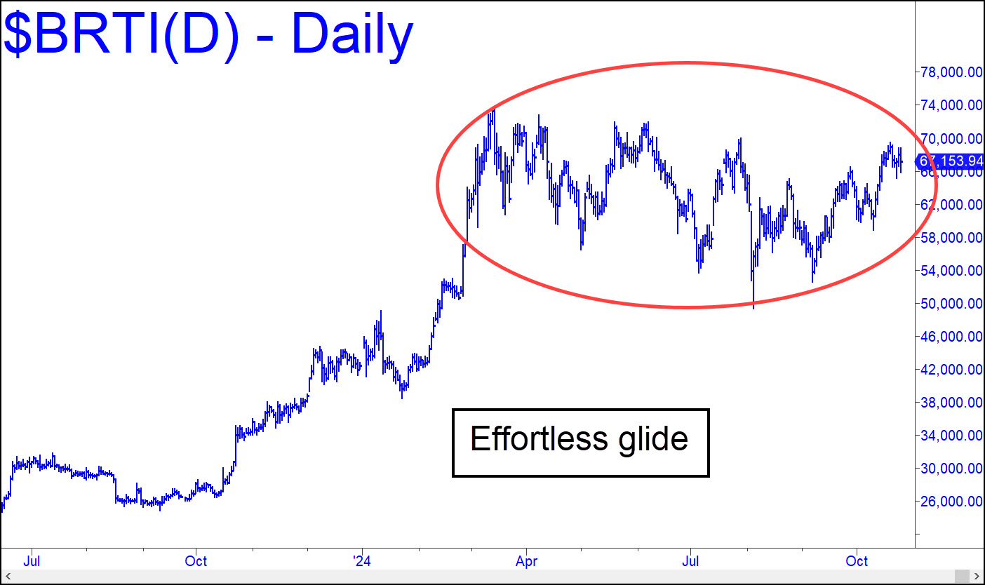 Considered from a technical standpoint, the weekly chart shows a clear target of at least 81,069, about $7.300 above the record 73,791 high achieved last March. However, the correction has dragged on for so long that I doubt it is merely to support a rally that would achieve only a marginal new high. In any event, bitcoin has been compressing for long enough that it would appear DaBoyz have $100,000 in mind, and my hunch is that they will succeed in moving it there. My forecast for the stock market is not nearly as bullish, and it’s difficult to imagine what scenario would drive such a divergence. However, I am not buying the silly notion that bitcoin, which has zero intrinsic value, will replace dollars as the coin of the realm, much less supersede gold as a safe haven when the banking system collapses. If anything, the implosion will forever destroy our misplaced confidence in all types of virtual money.