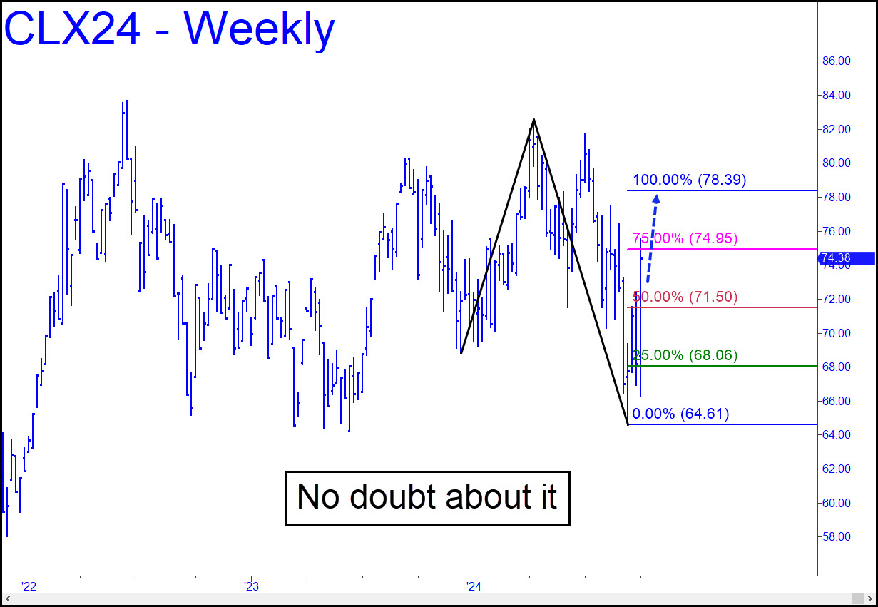 I’ve drawn a hypothetical rally to the 78.39 target as a straight line. Although the sharp move through p=71.50 makes the target very likely to be achieved, we should be prepared for countertrend swings that we can buy ‘mechanically’ to get a profitable piece of the trend. (Of course, fading minor trends within bigger ones will always be possible.) The uptrend is strong enough that we could expect to profit with a ‘red-line mechanical’ bid at p, stop 69.20. A stop-loss that wide won’t be necessary, however, since we have better tools at our disposal to cut textbook risk by as much as 95%. Let me note in passing that, for years, we’ve seen crude turn higher without fail each time pump prices fell to $3. Could there be better evidence that the biggest commodity market in the world is as crooked and sleazy as a three-card monte game on a midtown Manhattan sidewalk?