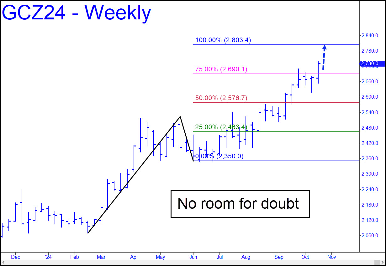 A 2803.40 rally target we’ve used for months should be achieved on or before the November election. The cycle that launched December Gold on its way to this Hidden Pivot resistance began last February from 2070.60. The smooth flow of the weekly chart belies the psychological difficulty of staying on board, since Mr Slammy did his best to scare investors away with nasty swoons along the way. This made them skittish about buying into strength, which lightened the rallies of would-be sellers. Looking just ahead, a pullback to the red line (p=2576.70), however unlikely, would trigger a ‘mechanical buy, stop 2501.10.