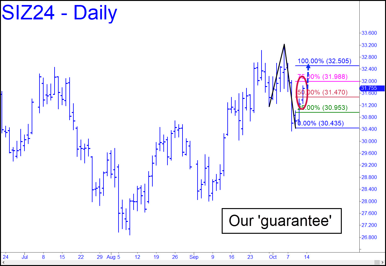 Buyers on Friday impaled the 31.74 midpoint Hidden Pivot resistance of the bullish pattern shown, all but guaranteeing the rally will reach a minimum d=32.505. If the futures get past it as easily as they have p=31.74, that would portend not just a test of the 33.25 peak recorded on October 4, but a breakout above it. The rally would then encounter the ‘D resistance of a bigger pattern at 33.33, giving us another opportunity to assess the trend’s staying power. A bigger picture provides high confidence that the December contract will eventually reach 37.249, a ‘D’ target on the monthly chart derived from a pattern stretching back to A=12.871 recorded in March 2020.