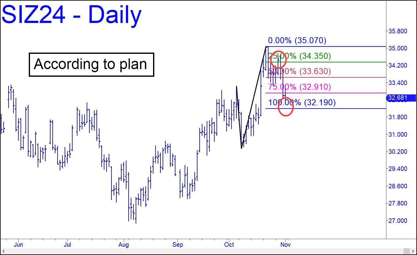 Correcting the reverse pattern shown has taken December Silver below the ‘hidden’ midpoint support at 33.63, implying it will likely require a move down to p2=32.91 for the futures to regain their footing; or even to d=32.19. In fact, a snap back rally to x=34.35 would trigger a ‘mechanical’ short, even if my enthusiasm for initiating the trade would not be high. If the retracement does hit d=32.19, though, it would be an excellent opportunity to bottom-fish with a tight stop loss. ______ UPDATE (Nov 2): The futures danced to our beat last week, triggering a ‘mechanical’ short at x=34.35 that would have evinced little pain. Now they are on their way down to d=32.19 of this pattern. You can bottom-fish with a reverse-pattern trigger that uses a= 33.26 from Oct 25. That implies a 72-cent trigger interval, but you can reduce it by perhaps 95% by using a pattern from the 5-minute chart or less. _______ UPDATE (Nov 6, 8:26 p.m.): You can still try bottom-fishing using the 32.19 ‘d’ target to set up a low-risk trigger, but this chart shows what to expect if ‘d’ fails to hold. Worst case for the intermediate term could be as low as 28.455, but there’s no reason to assume it will be that bad unless sellers start crushing p and D/d supports of different degree.