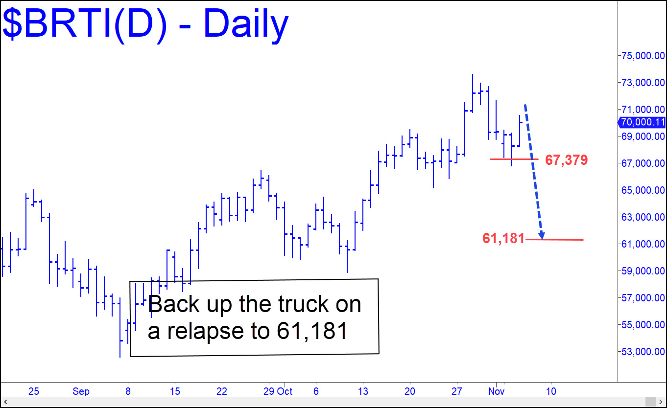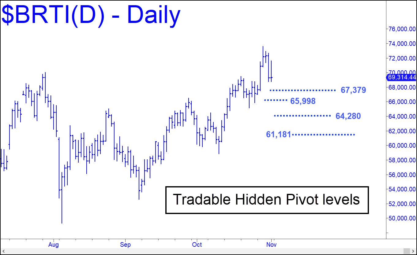 The chart shows four Hidden Pivot levels that could yield cautious entry set-ups for traders who shun risk and especially fear high-volatility monsters like this one. We typically trade such levels using ‘reverse-pattern’ triggers that are discernible on the lesser intraday charts. This tactic is proprietary, but you can seek guidance in the Rick’s Picks trading room, a hangout for some of the best day traders you will find online. Please note that if one of the levels shown is decisively (i.e., by more than 0.5%) penetrated on first contact, the next will automatically become the minimum downside target. The lowermost of the targets shown is 61,181, a Hidden Pivot that you should treat as a back-up-the-truck number likely to produce a precise, and therefore easily tradable, low. _______ UPDATE (November 5, 2:36 p.m.): A bullish bet at 67,379, the first place I’d suggested looking for an upturn in the post below, would have produced a gain so far of $3,146. That is based on a so-far high of 70.525 for the move. The low at 66,803 was less than 1% beneath the ‘hidden’ support of the line I drew on the chart accompanying the earlier post. My hunch is that bitcoin will relapse to get a running start on the record 73,578 high recorded on October 29. If so, a tightly stopped bid at 64,280 can be attempted. However, 61,181 is still a back-up-the-truck place to get long ahead of a presumptive record-breaking run-up in the unlikely even Bertie pulls back sharply. Please note that the BRTI symbol is a real-time proxy for bitcoin that reflects the best bids and offers across many crypto markets at a given instant. For trading purposes, you can interpolate my targets, support and resistance levels.