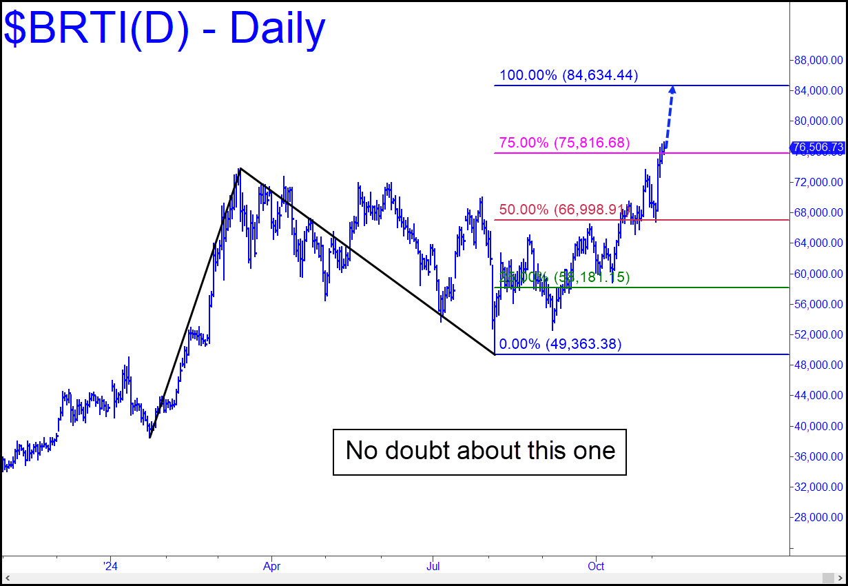 Bitcoin is still on a buy signal from 67,379, although the pullback I was looking for to reload has mutated into a lunatic-powered bender. Is Trump more bullish for cryptocurrencies than Harris would have been? Probably not. It’s more a case of everything being bullish for bitcoin at the moment. The chart says nothing can prevent it from achieving the 84,634 target shown. Beyond it lies a roundest-of-all-numbers benchmark at $100,000 that every crypto crazy has dreamed about for years, even after prices collapsed in 2022 from a then-record 68,964 to 15,484. Enjoy the show and use my bullish targets to book profits on the way up (and to get short sometimes). However, no matter how high it goes, don’t lose sight of the fact that bitcoin has no real value other than to speculators.