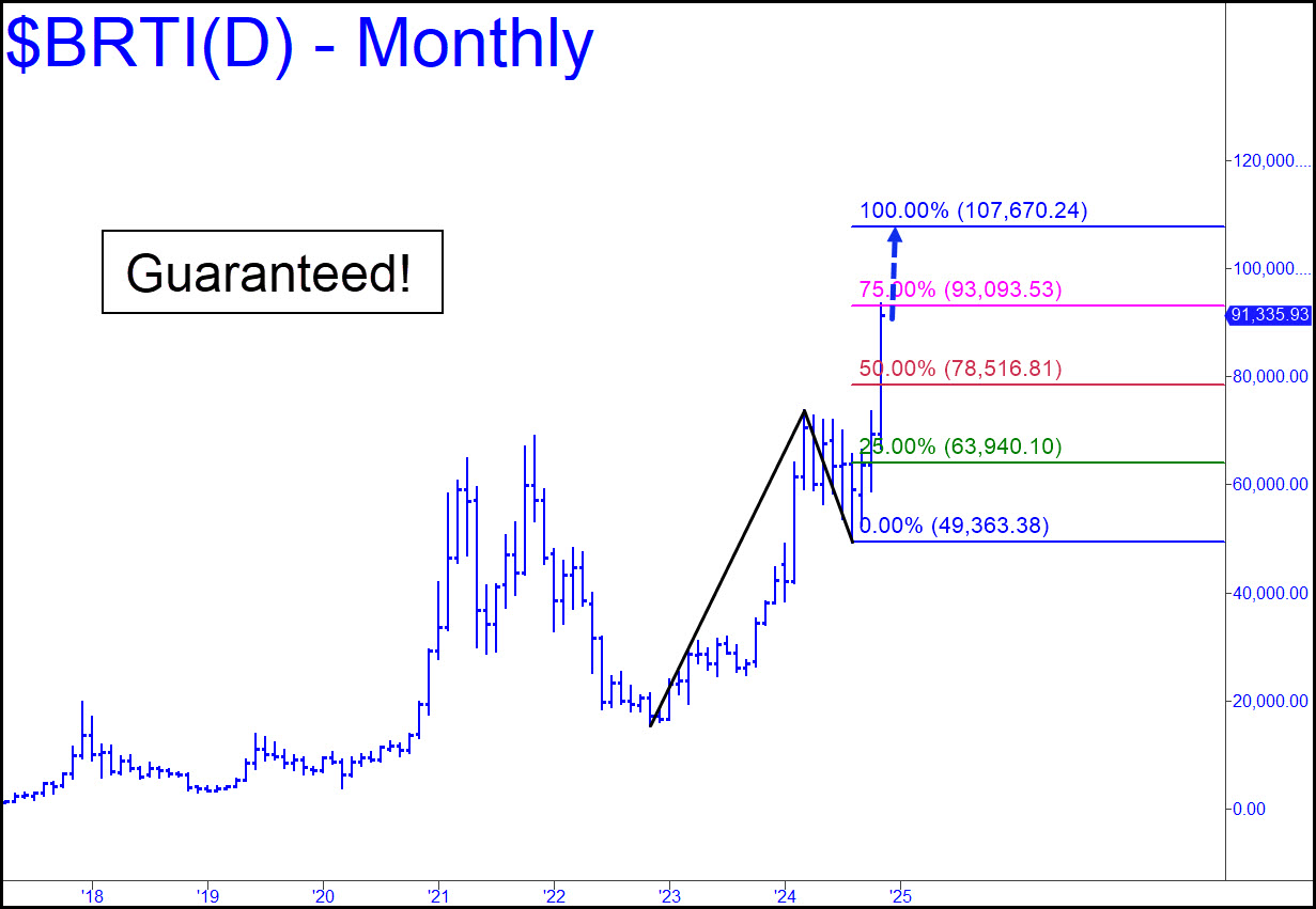It’s tempting to think in round numbers like the pundits who shill this hoax, but a mere $100,000 is not where bitcoin is going next. From a Hidden Pivot perspective, it appears nearly certain to achieve the 107,670 target shown in the chart, or 119,253 if any higher. The same bozos like to throw out absurdities like $500,000, or $1 million, but why stop there? The true believers who have stayed with bitcoin since it changed hands for a dime a copy (Oh yes, it did!) don’t have limits, so let’s not rain on their parade. As for the rest of us, I’d suggest taking these Hidden Pivot targets seriously because nothing goes up forever and because, in my estimation, one or the other Hidden Pivot resistance has an excellent chance of capping the literally insane rally that has made bitcoin the speculative sensation of the digital era.