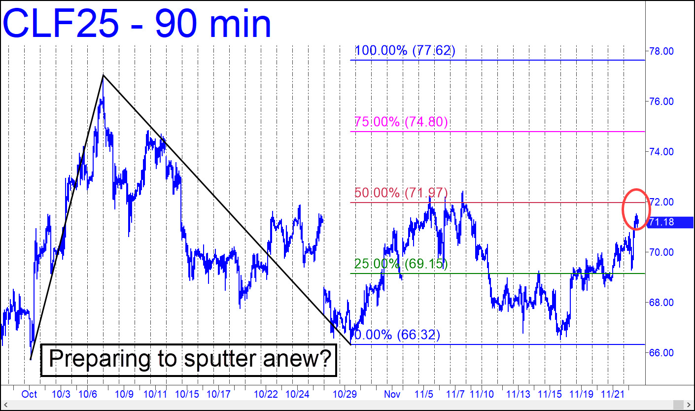 Crude’s rallies have failed so reliably at p that I’ve stretched the pattern a bit to provide some upside targets if it should break loose this time. More likely is that the January contract will hit p, noodle around for a few days, then resumes the weakness that has characterized this commodity since July. A retracement to the green line would not necessarily beckon a ‘mechanical’ buy. If this vehicle mildly surprises by continuing higher, I would still expect price action over the next few months to fall within the range $68-$75. Of course, that is barring a geopolitical shock that would push quotes to $80 or higher. ______ UPDATE (Nov 29): The futures performed even worse last week than my dismal forecast had anticipated: first by failing by 46 cents to reach the red line (p=71.97), and then by staying aloft for barely more than a day at the top of the rally. Let’s embrace the good news: 1) the sleazeballs who rig the oil markets had little buoyancy to work with, and 2) gas prices will be coming from lower lows the next time the bad guys goose quotes on the flimsiest pretext. ______ UPDATE (Dec 7): Is yet another test of support coming at 66.32, the point ‘C’ low of the faintly bullish pattern shown in the inset? It sure looks that way, and it’s hard to get interested, never mind excited. Zzzzzzzzzzz.