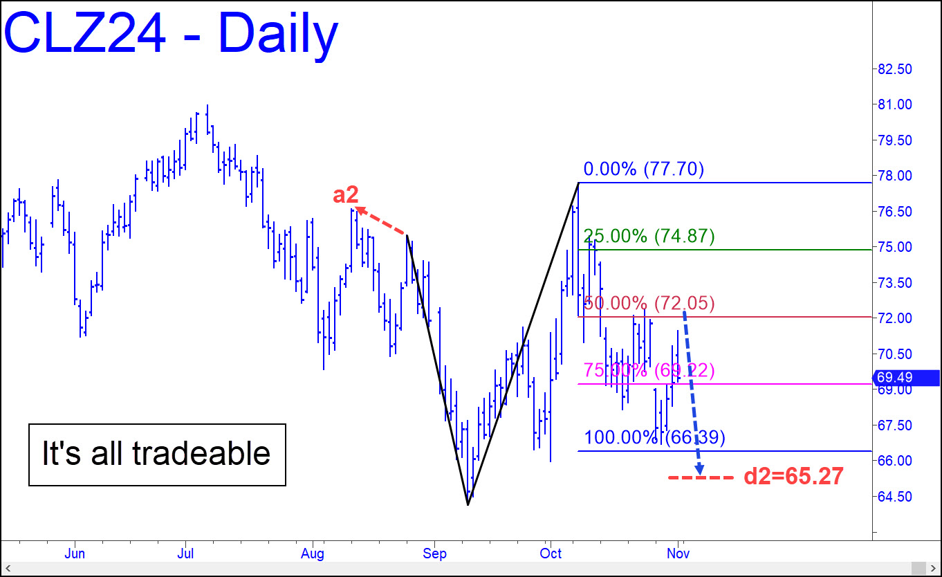 The futures bottomed 33 cents above the 66.39 ‘d’ target of a reverse pattern I flagged here last week, hinting that the riffraff was in there bottom-fishing. No matter, since we can always figure out ways to keep a couple of steps ahead of the clowns. For starters, I’ve moved the point ‘a’ high to the left, using a ‘locked’ high to form a reverse pattern that few if anyone will see. Bottom-fish the 65.27 target with as tight a stop-loss as you can craft if the opportunity arises. More immediately, the rally would trigger a ‘mechanical’ short if it touches the red line (p=71.49, although I am recommending the trade only to ace Pivoteers who know how to calculate the appropriate stop-loss.