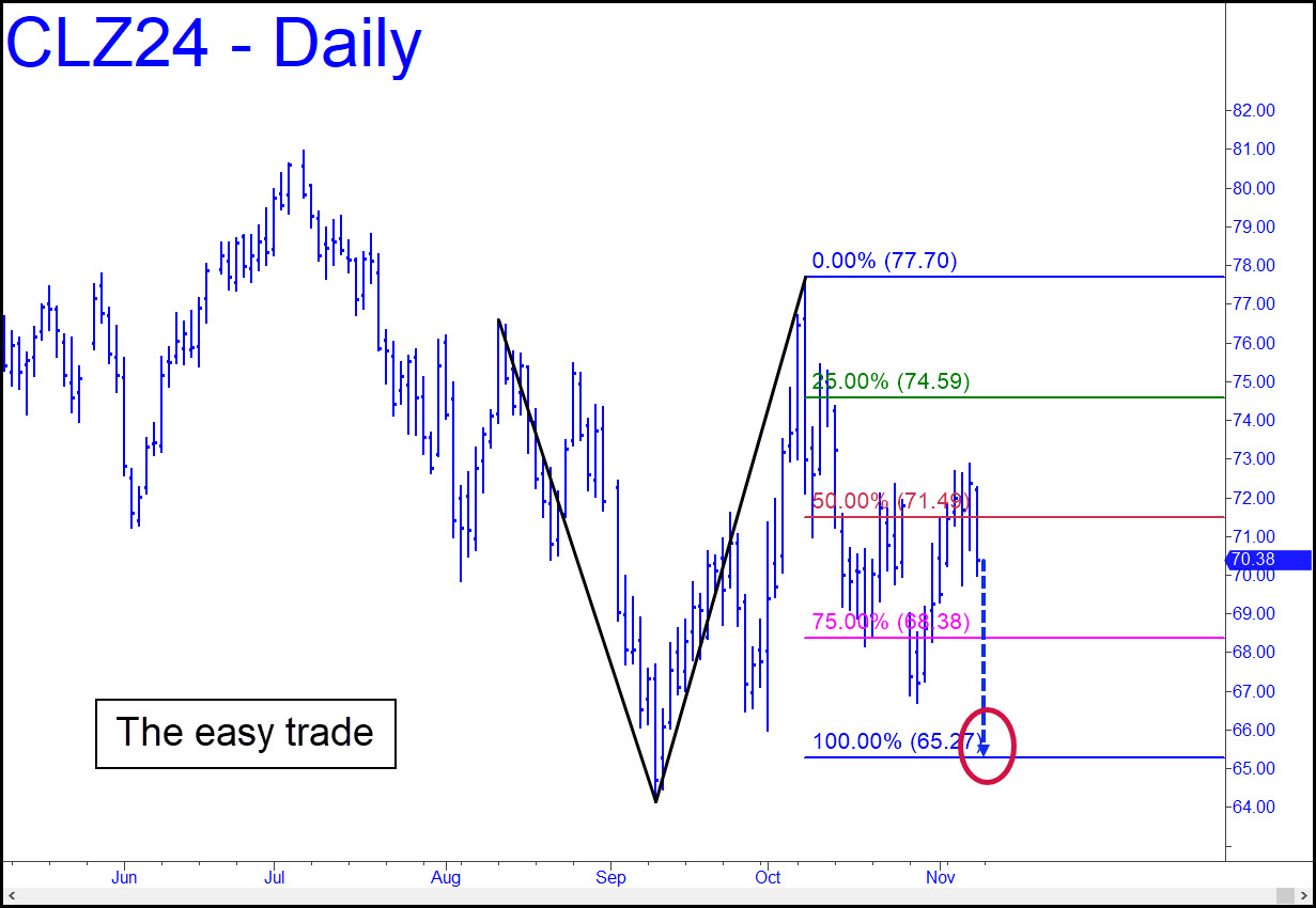 The futures rallied somewhat higher than we might have preferred last week, generating a bullish impulse leg in the process. This implies that any sequence of trading strategies we employ should have a bullish component. That would take work, however, requiring us to pay attention to a vehicle that is painful to watch. Crude’s price action is animated almost solely by clowns and thieves, so I suggest opting for the no-brainer trade, even if it takes a while to set up with a drop to 65.27 (see inset). That might not occur, but it is still the only trade we should be interested in at the moment — a no-brainer with excellent odds and risk under very tight control. Plus, it will enable us to avoid taking crude’s freakish price action seriously. Considering that this is the biggest commodity market in the world, its rigged behavior is a disgrace to civilization itself.