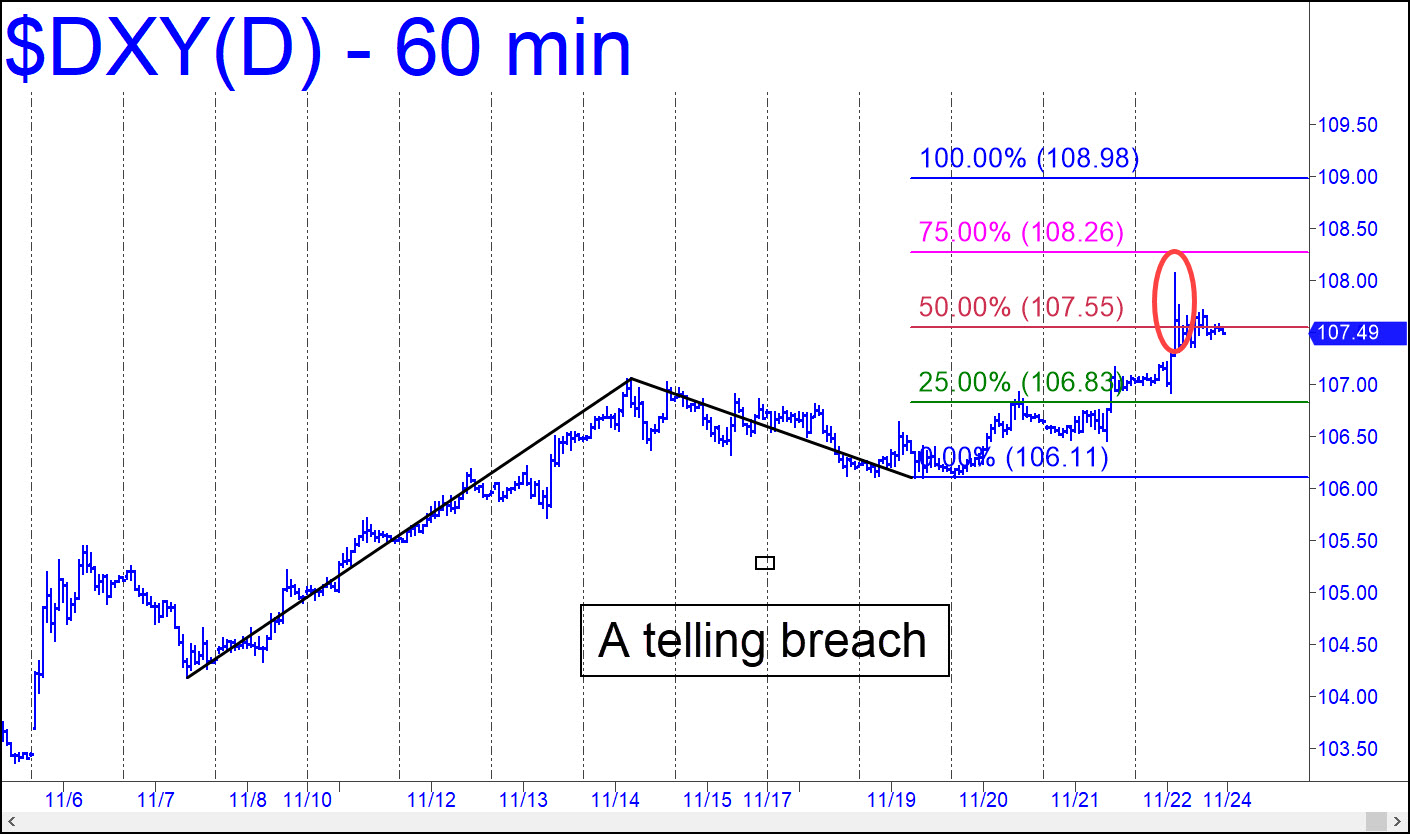 DXY’s sharp poke on Friday through p=107.55, the midpoint Hidden Pivot, implies the rally is very likely to reach the pattern’s 108.98 target. This symbol is not optionable, but you can trade the futures contract by interpolating my targets. It is encouraging to see bullion strengthen with the dollar rampaging higher. Its potential on DXY’s long-term chart is to 119.37, or 124.82 if any higher (monthly chart, A= 89.54 on 5/31/21). A move of that magnitude would put enormous strain on all who owe dollars, and a ruinous deflation would likely be the result. This would occur irrespective of the level of nominal interest rates, since it is the real (i.e., inflation-adjusted) burden of debt that matters, not the marquee number.