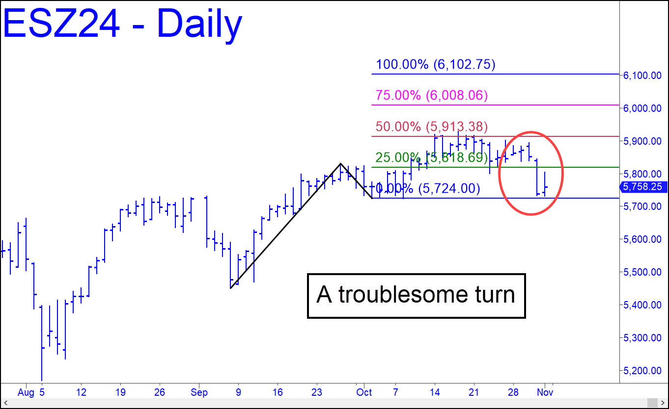 We began last week with an ambitious bull-market target at 6102, but heavy selling on Thursday nearly negated the bullish pattern from which that Hidden Pivot was derived. It is still theoretical viable, but I doubt it will survive. That would imply a trend failure at a midpoint of daily-chart degree [p=5913), a usually reliable indicator of an important trend change. Now, if minor ‘D’ corrective targets start giving way easily, we would have reason to infer the long-term bull cycle begun in March 2020 is over. I will be tracking this closely, so keep your email ‘Notifications’ switched on and stay close to the chat room if you want to stay apprised in real time. ______ UPDATE (Nov 6, 6:25 p.m.): There are numerous ABCD patterns projecting significantly higher, but here’s one I especially like that all but guarantees minimum upside to 6084.00. This Hidden Pivot resistance lies 122 points above, a 2% move. This assumes that another promising target at 5961.75 discussed in the chat room gets swept away before dawn by Trump fever, as appears likely. The futures are head-butting this obscure ‘hidden’ resistance in after-hours trading. Short the higher target using as tight a stop-loss as you can craft, preferably with a small-degree rABC trigger (aka ‘camouflage’), but your trading bias should be bullish until the futures get there. _______ UPDATE (Nov 8, 12:04 p.m.): The futures are now bound for at least 6200.25. That’s 178 points, or 3%, above the current 6022. My high confidence in this target is based on the way the Trump waft has impaled the 5962.25 ‘midpoint Hidden Pivot resistance’ (p) shown in this chart. Price action at ‘p’ is a reliable and accurate indicator of trend strength. Please note as well that a sharp pullback to the green line (x=5843.25), however unlikely, would trigger a salacious ‘mechanical’ buying opportunity, stop 5724.00. In practice, we would use a small-degree entry trigger to cut initial, theoretical risk by as much as 95%.