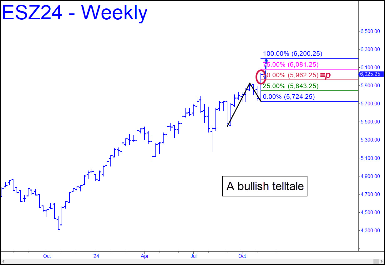The Trump waft that began in early September turned into a full-blown short squeeze on Tuesday afternoon as rumor, anecdote and exit polls began to hint of a Trump victory. The rally steepened in after-hours trading and continued to gain altitude until the closing bell on Friday. It projected most immediately to 6130.50, but there is an even higher target at 6200.25 (see inset) that you should use as a minimum upside projection in the days ahead. It is an odds-on bet to be achieved because of the ease with which the 5962.25 midpoint Hidden Pivot resistance was penetrated. I expect a tradable top to form there, but you should be familiar with ‘camouflage’ triggers if you intend to get short. Stay close to the chat room if you are interested in the trade.