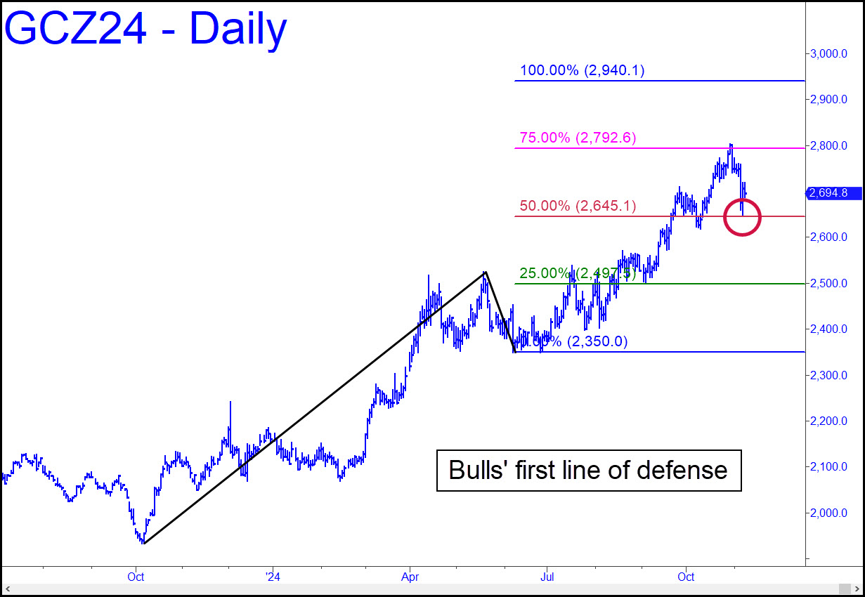 Gold futures have taken a nasty hit since topping on October 30 within 1.60 of a well-advertised Hidden Pivot target of mine at 2803.40. Even so, the downdraft has yet to generate an impulse leg on the daily chart by exceeding two prior lows. That would occur with a print at 2618.70, but even then, its putative power could be diminished if the bounce from Thursday’s low gets a little more loft. We’ll give bulls the benefit of the doubt as the new week begins by assuming a ‘mechanical’ buy at the red line produces a big winner. The target would be 2940.10 (see inset), and the initial stop-loss would be at 2546.70. Please note that the trade has yet to trigger, since the selloff has gone no lower than 2650.30. Paper-trade this one only if your Hidden Pivot chops are up to snuff. _______ UPDATE (Nov 11, 12:08 p.m.): This morning’s avalanche brought the futures down to the red line, so I’ll suggest using a $17 trigger interval to get long. This is bigger than I would prefer, but it will diminish the chance of a false signal. With a so-far low of 2619.20, the ‘buy’ signal would occur on a 2636.20 print. Your first profit-taking objective would be at p=2653.20, where d=2687.20 (60-min, a=2650.30 on 11/6). This is a paper trade for all but the most intrepid Pivoteers. I am mainly interested in determining whether bullion has topped for the long term. The trade set-up I am suggesting is a good way to answer that question, and a rally that exceeds ‘d’ would imply the answer is ‘no’. Alternatively, if the rally dies at ‘p’, that would be a very discouraging sign.
