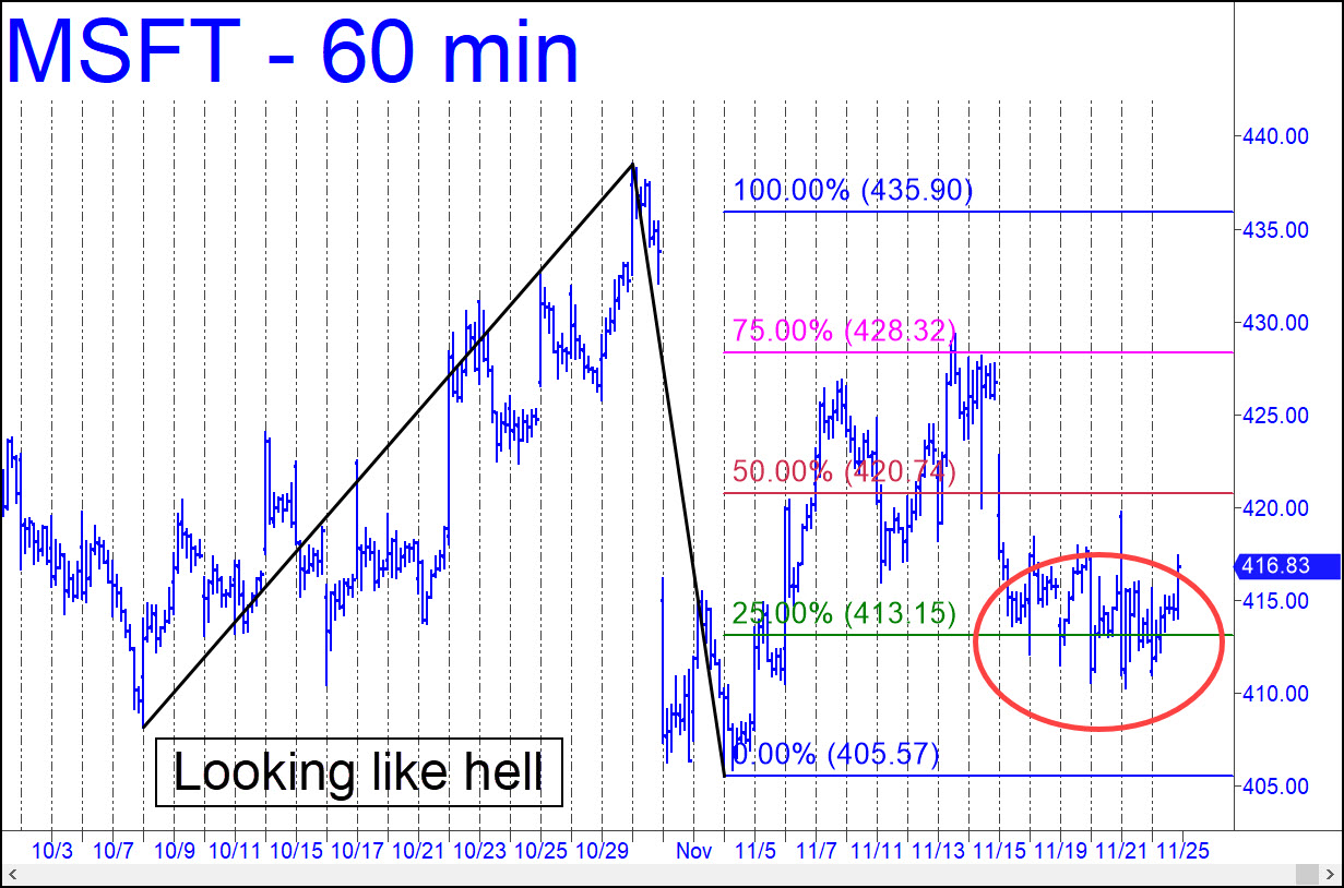 I’ve always treated MSFT as an infallible bellwether. My narrow, if not to say obsessive, focus has served us well, since MSFT has stayed consistently a step ahead of the broad averages, and even ahead of other stocks in the lunatic sector (i.e., the atrociously misnamed Magnificent Seven). But the long bull market has not conditioned us to think that when MSFT acts like crap for an entire year, as it has, that it is signaling a possible end to the bull market. This I will infer, however, implying that the failure to produce an easy ‘mechanical’ winner after falling to the green line on November 18 is further evidence of a waning bull. This observation would be strengthened by a dip below C=405.57 without having first achieved D=435.90. The target and pattern will remain viable as long as 405.57 is not breached.