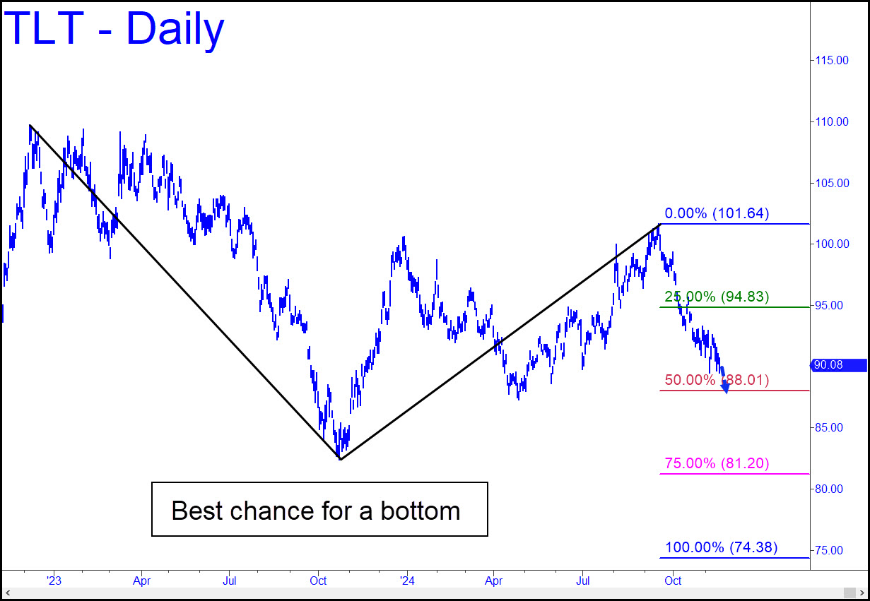 The ferocious but badly mistaken rally in the days after the election petered out as expected, giving way to a relapse that will soon test crucial support at p=88.01. That is my minimum downside target for the near term, but it is also where the brutal slide from mid-September’s 101.64 peak could end. That would imply nothing less than the resumption of the bull cycle begun 13 months ago. I have adjusted p, as well p2 and D, downward to correct an erroneous coordinate used in my calculation of Hidden Pivot levels on the weekly chart. Respectively, they lie at 81.20 and 74.38.