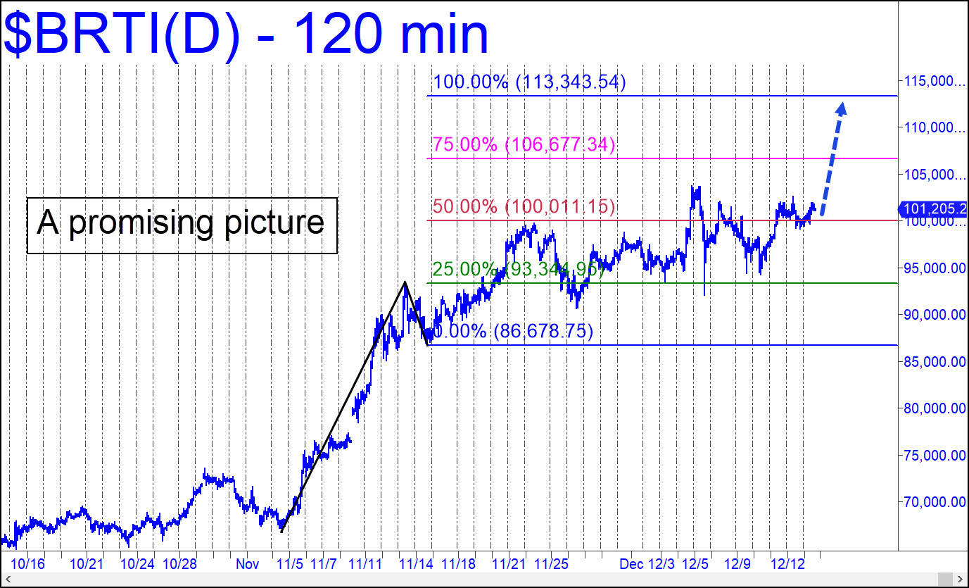 I’ve reproduced the ‘mystery levels’ that were blacked out earlier because the pattern has been quite useful for trading purposes. The pullback from p=100,011 was easy to short, as was getting long ‘mechanically’ on the 12/5 pullback to the green line (x=93,344). With any luck, the next burst will hit D=113,343 exactly, providing us with an optimal place to exit long positions and/or reverse them with the tightest stop-loss conceivable. The balky action at p means there can be no guarantee that D will be reached, so don’t hesitate to attempt shorting at p2=106,677 with a reverse-pattern trigger that cuts theoretical entry risk down to size. _______ UPDATE (Dec 16, 1:52 a.m. EST): BULLSEYE! The 106,677 Hidden Pivot I’d suggested using to short this rabid badger caught the top of a $3,900 spike within one-tenth of a percentage point. It was a new record high for Bitcoin, and the precipitous reversal that followed could have been worth as much as $2,378 so far to any subscriber who was paying close attention. The ‘camouflage’ trigger I’d advised using to hold entry risk down to a practical minimum is a proprietary trick, but for the record, the short would have triggered at 106,314 less than two minutes after the top was in.