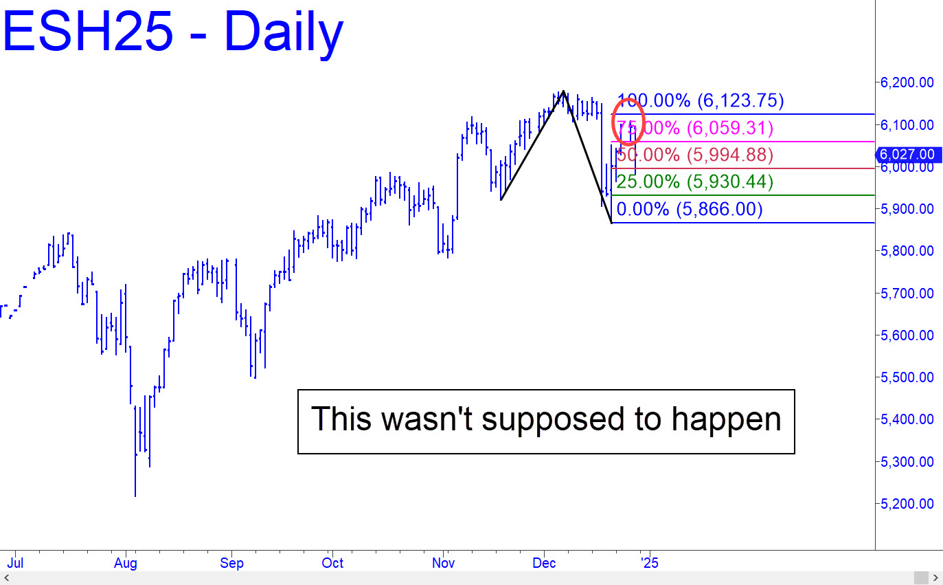 The S&Ps have yet to collapse in the heat of Santa Season as I had suggested they might, but they are acting mighty strange. Friday should have been a slam-dunk for bullish seasonality. Instead, the futures doubled-topped just shy of a juicy rABC rally target before selling off hard to end the week. Granted, there was a heavy layer of supply just beneath early December’s record high near 6200. But it’s not as though setting up a short-squeeze to get past it should have posed any difficulty for the scumballs who manipulate the markets. Let’s give it another day to see whether the thimble-riggers are impaired or merely toying with shorts. If the latter, the futures should produce a profitable ‘mechanical’ buy at the green line (x=5930.44). You can trade this one for real if you know what you are doing, but it is not recommended for Hidden Pivot greenhorns.