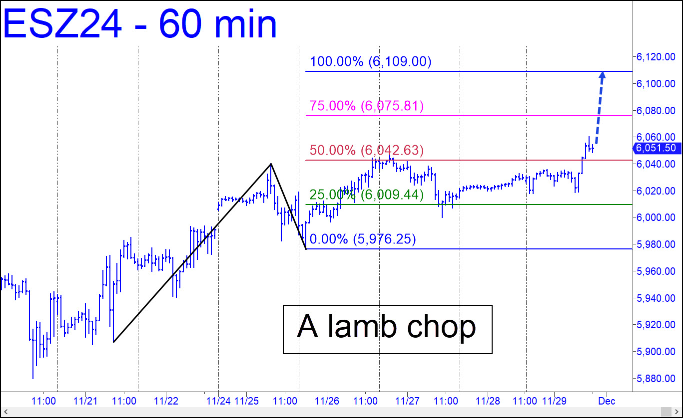 The pattern shown has worked perfectly so far, signaling a winning short from the red line and a theoretically juicy payoff from ‘mechanically’ bottom-fishing at the green line (x=6000.44). That means it’s equally likely to work for getting short at D=6109.00 with a tight stop. Shining a spotlight on the trade on my front page could slightly queer the pattern’s voodoo magic, so I’d suggest using a reverse-pattern trigger of small degree (i.e., sub-5 minute) to execute the trade. Because the first contact with p=6042.63 on the way up did not impale this Hidden Pivot resistance, there can be no ironclad guarantee the target will be reached, although it seems likely.